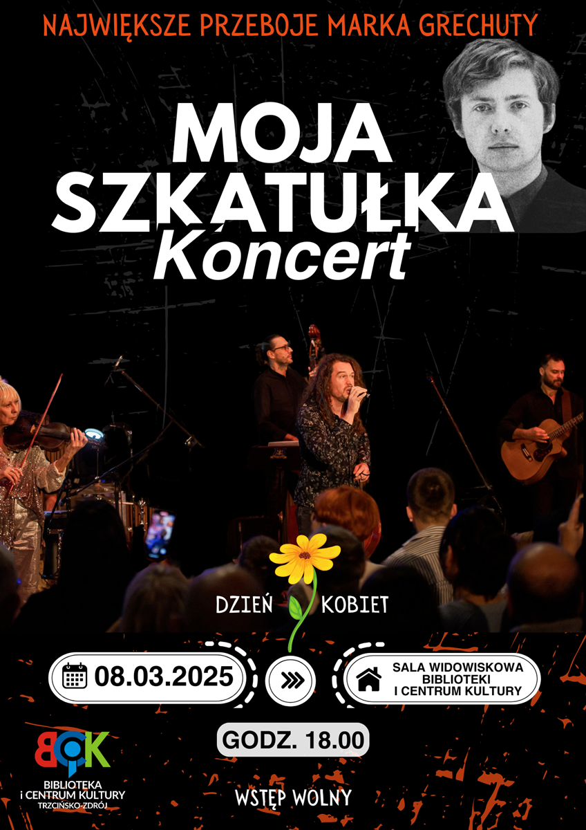 Serdecznie zapraszamy 8 marca 2025 (sobota) o godz. 18:00 do sali widowiskowej BiCK na koncert zespołu „Moja Szkatułka”, podczas którego usłyszycie największe przeboje niezapomnianego Marka Grechuty. To doskonały sposób, by uczcić Dzień Kobiet w wyjątkowej atmosferze i przy pięknej muzyce! Przyjdźcie razem z najbliższymi i dajcie się porwać ponadczasowym utworom, które wzruszają, bawią i inspirują. Moja szkatułka Tribute to Marek Grechuta to spotkanie z doskonałą poezją i muzyką z repertuaru zespołu Anawa, którego twórcą był znany wszystkim Marek Grechuta. Koncert grany jest w wersji akustycznej na gitarę, kontrabas, instrumenty perkusyjne i skrzypce. Utwory zostały zaaranżowane tak, aby publiczność mogła śpiewać wspólnie z wokalistą znane refreny piosenek takich jak „Będziesz moją panią”, „Dni których nie znamy”, „W dzikie wino zaplątani”i wiele innych