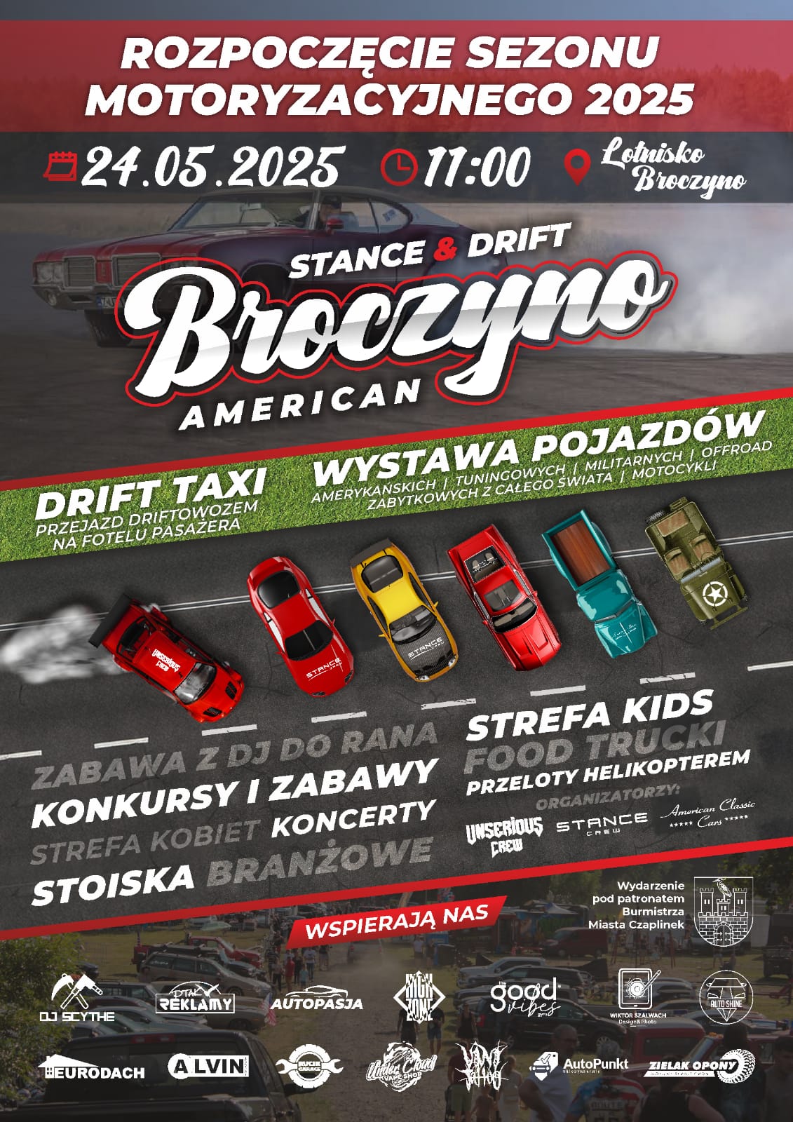 Zapraszamy wszystkich miłośników motoryzacji na rozpoczęcie sezonu motoryzacyjnego 2025 które odbędzie się 24.05.2025 o 11:00 na lotnisku Broczyno. W programie m.in.: - Drift taxi - przejazd driftowozem na fotelu pasażera, - Wystawa pojazdów – prezentacja samochodów amerykańskich, tuningowanych, militarnych, off-roadowych, motocykli oraz zabytkowych z różnych zakątków świata, - Strefa zabawy – zabawa przy muzyce DJ-a do rana, - Konkursy i atrakcje, - Strefa koncertowa, - Strefa kobiet, - Strefa kids, - Food trucki, - Przeloty helikopterem, - Stoiska branżowe.