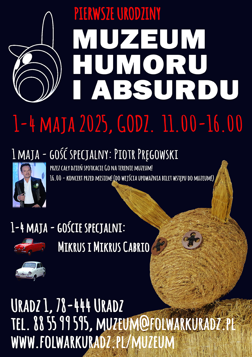 Po zimowej przerwie czas wybudzić ze spokojnego snu Misia. Tak! Tego Misia! Misia z "Misia"! Pierwsze urodziny Muzeum Humoru i Absurdu w Uradzu to okazja do zaprezentowania kilku eksponatów jeszcze nieznanych szerokiej publiczności. Wśród nich Dzika 2. Projekt mikrociągnika Dzik opracowali w 1957 roku inżynierowie Tomasz Pacyński i Stanisław Goriaczko. W 1959 roku seryjnie wyprodukowano 300 egzemplarzy ciągnika Dzik 1 i produkcję wstrzymano, by w 1960 roku uruchomić produkcję ciągnika o prostszej i bardziej ekonomicznej budowie - Dzik 2. Na przełomie lat 60. i 70. wprowadzono wersję Dzik 21, którą produkowano do lat 80. Innym, bardzo ważnym dla polskiej motoryzacji pojazdem, jaki na stałe zagościł w muzealnej ekspozycji jest kultowy Junak, nazywany "polskim Harleyem". W PRL-u był produkowany jedynie przez 10 lat (1956-1965). W pełni autorska konstrukcja została opracowana w Biurze Konstrukcyjnym Przemysłu Motoryzacyjnego i był najcięższym motocyklem i jedynym z silnikiem czterosuwowym produkowanym w PRL-u. Łącznie, w Szczecińskiej Fabryce Motocykli wyprodukowano około 91 tys. pojazdów, w tym modele M07, M07-R, M07-C, M10 i trójkołowce B20. Skoro świętujemy urodziny, to będą także goście specjalni! 1 maja, przez cały dzień, w muzeum spotkać będziecie mogli legendę polskiej komedii - Piotra Pręgowskiego. Będzie to okazja do uściśnięcia ręki czy zrobienia pamiątkowego zdjęcia przy kultowych miskach ze sztućcami na łańcuchu, wzorowanymi na "Misiu" Stanisława Barei. A o 16.00 zapraszamy na koncert Piotra Pręgowskiego - na specjalnej scenie przed Misiem! Do wstępu na koncert upoważnia aktualny bilet wstępu do muzeum! Przez cały długi weekend fotografować będziecie się mogli z innymi naszymi gośćmi specjalnymi - polskimi samochodami Mikrus i Mikrus Cabrio! Od 1 do 4 maja Muzeum Humoru i Absurdu czynne będzie w godz. 11.00-16.00. Bilet wstępu kosztuje 33 zł (normalny), 23 zł (studencki, szkolny lub zbiorowy - powyżej 12 biletów kupowanych jednorazowo). W przypadku pytań, potrzeb, chęci osobistego spotkania z Misiem etc. - proszę o kontakt.