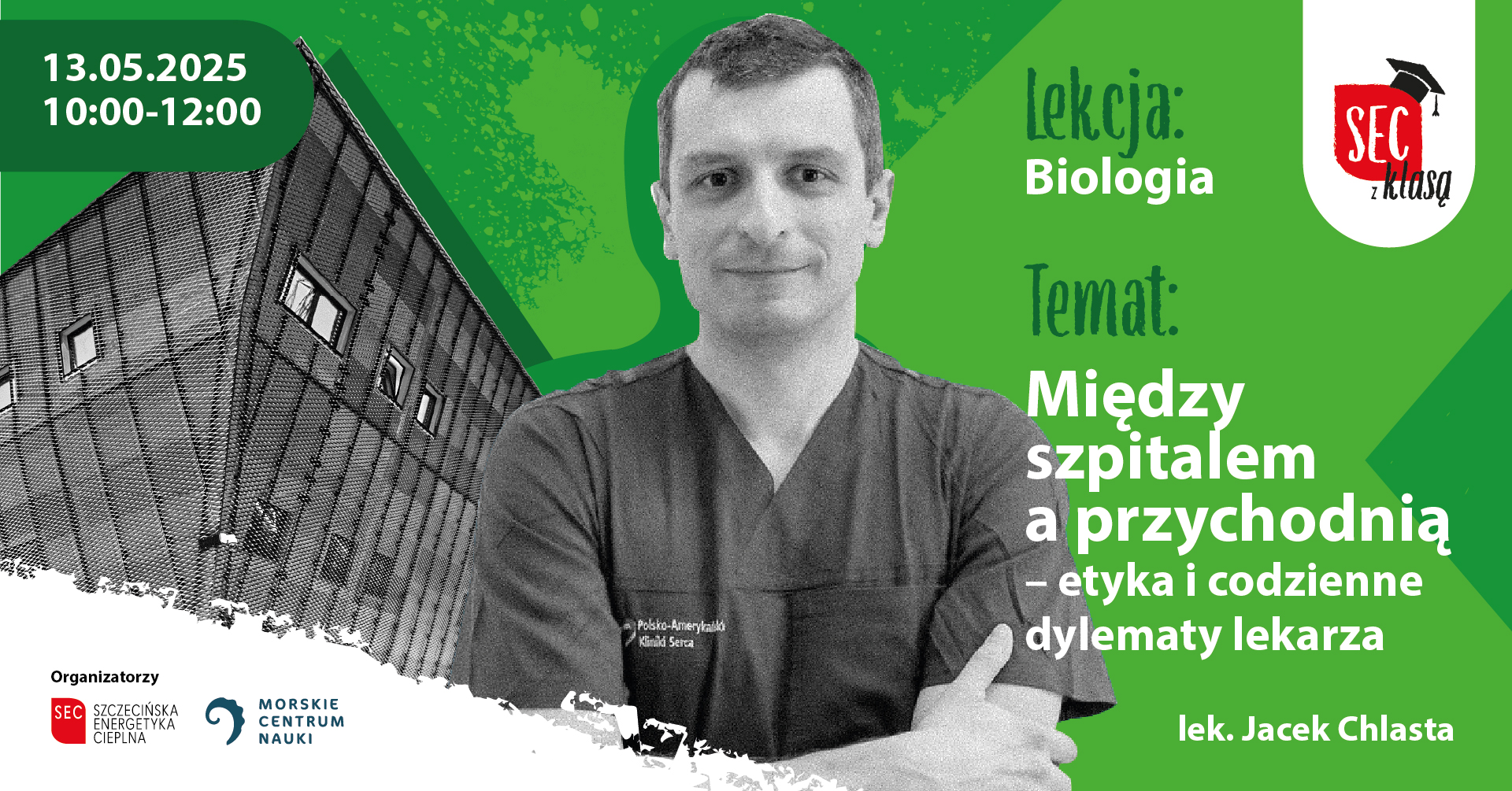 Zapraszamy na wykład lek. Jacka Chlasty, pt. "Między szpitalem, a przychodnią – etyka i codzienne dylematy lekarza" – 13 maja (wtorek) w godz. 10:00 – 12:00 do Sali Konferencyjnej Morskiego Centrum Nauki (I piętro). W trakcie poruszymy następujące zagadnienia: 1. Różnice w pracy lekarza w szpitalu i przychodni - Specyfika pracy w obu miejscach – intensywność, zakres obowiązków, kontakt z pacjentem - Ograniczenia czasowe i ich wpływ na decyzje medyczne - Relacja lekarz-pacjent w różnych środowiskach pracy 2. Dylematy etyczne w codziennej praktyce - Konflikt między dobrem pacjenta a ograniczeniami systemowymi (czas, zasoby, procedury) - Dylematy związane z dostępem do leczenia i priorytetyzacją pacjentów - Granica między zaangażowaniem emocjonalnym a profesjonalizmem 3. Trudne decyzje medyczne i moralne. WAŻNE! Ilość miejsc jest ograniczona, zapraszamy (max 2-3 klasy). O rezerwację prosimy poprzez email na adres: marketing@centrumnauki.eu Wykład odbędzie się w ramach kampanii „SEC z klasą” – cyklu zajęć edukacyjnych skierowanych do szkół ponadpodstawowych organizowanej przez #SEC wraz z #MCN, podzielonej na moduły edukacyjne opracowane tak, aby odpowiadały podstawie programowej z przedmiotów takich jak fizyka, chemia, biologia, informatyka oraz historia. Serdecznie zapraszamy.