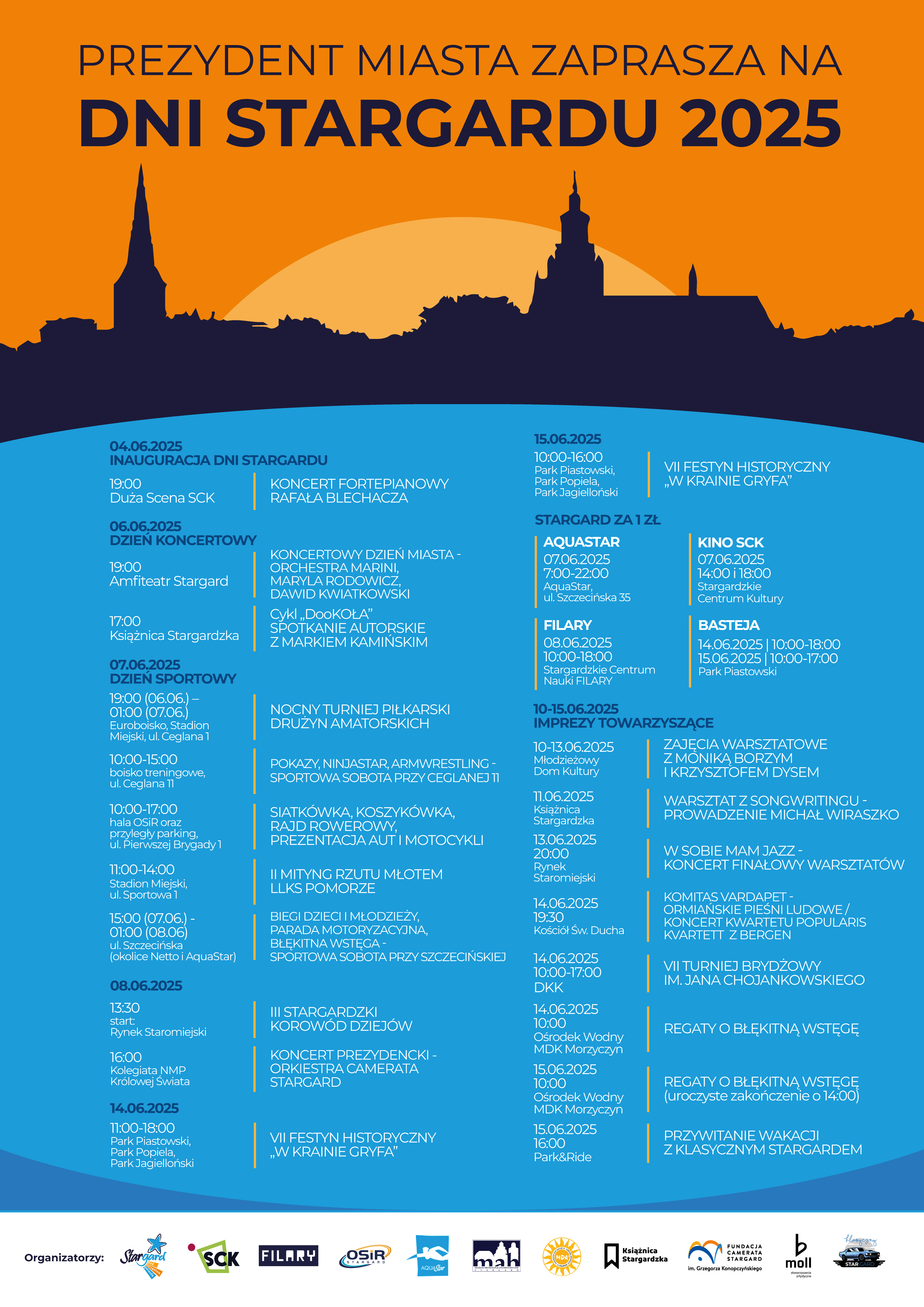 Prezydent Stargardu zaprasza na Dni Stargardu 2025! Przed nami dwa tygodnie pełne niezapomnianych emocji, świetnej zabawy i niezwykłych wydarzeń! Będzie koncertowo, artystycznie, kulturalnie i sportowo – każdy znajdzie coś dla siebie. To nie wszystko! Stargardzianie i goście będą mogli wziąć udział w wielu imprezach towarzyszących. Zarezerwujcie czas i bądźcie z nami – Dni Stargardu 2025 zapowiadają się wyjątkowo! Szczegółowe informacje na plakacie na https://sck.stargard.pl/kalendarz-wydarzen/dni-stargardu-2025/
