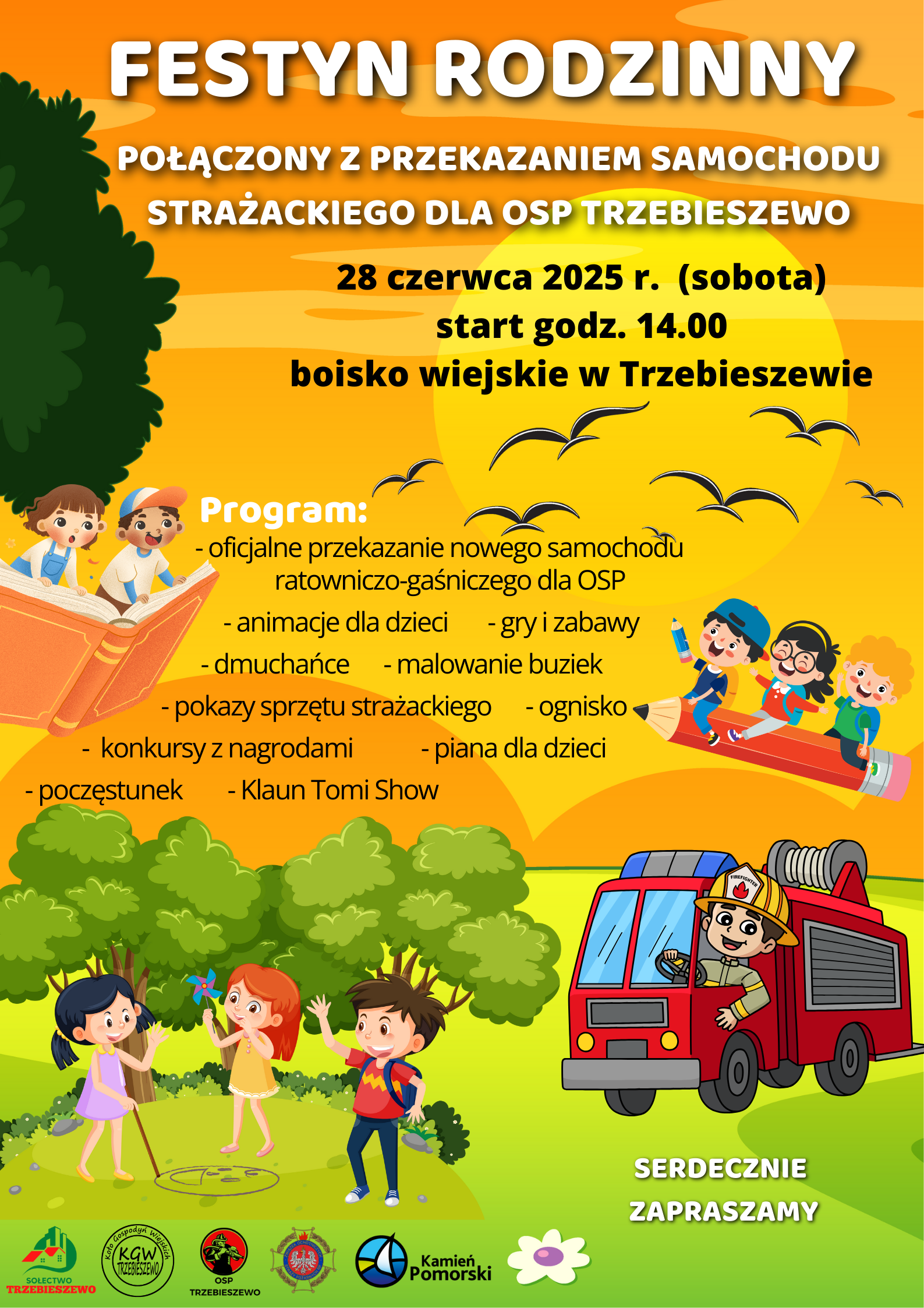 Serdecznie zapraszamy na Festyn Rodzinny w Trzebieszewie! Czeka na Was mnóstwo atrakcji dla dzieci i dorosłych – wspólna zabawa, pyszne jedzenie, konkursy i występy! Głównym punktem programu będzie uroczyste przekazanie nowego samochodu strażackiego dla OSP Trzebieszewo – nie przegapcie tego wyjątkowego momentu! ???? Data: 28.06.2025 ???? Miejsce: boisko wiejskie w Trzebieszewie] ???? Godzina rozpoczęcia: 14.00 Do zobaczenia!