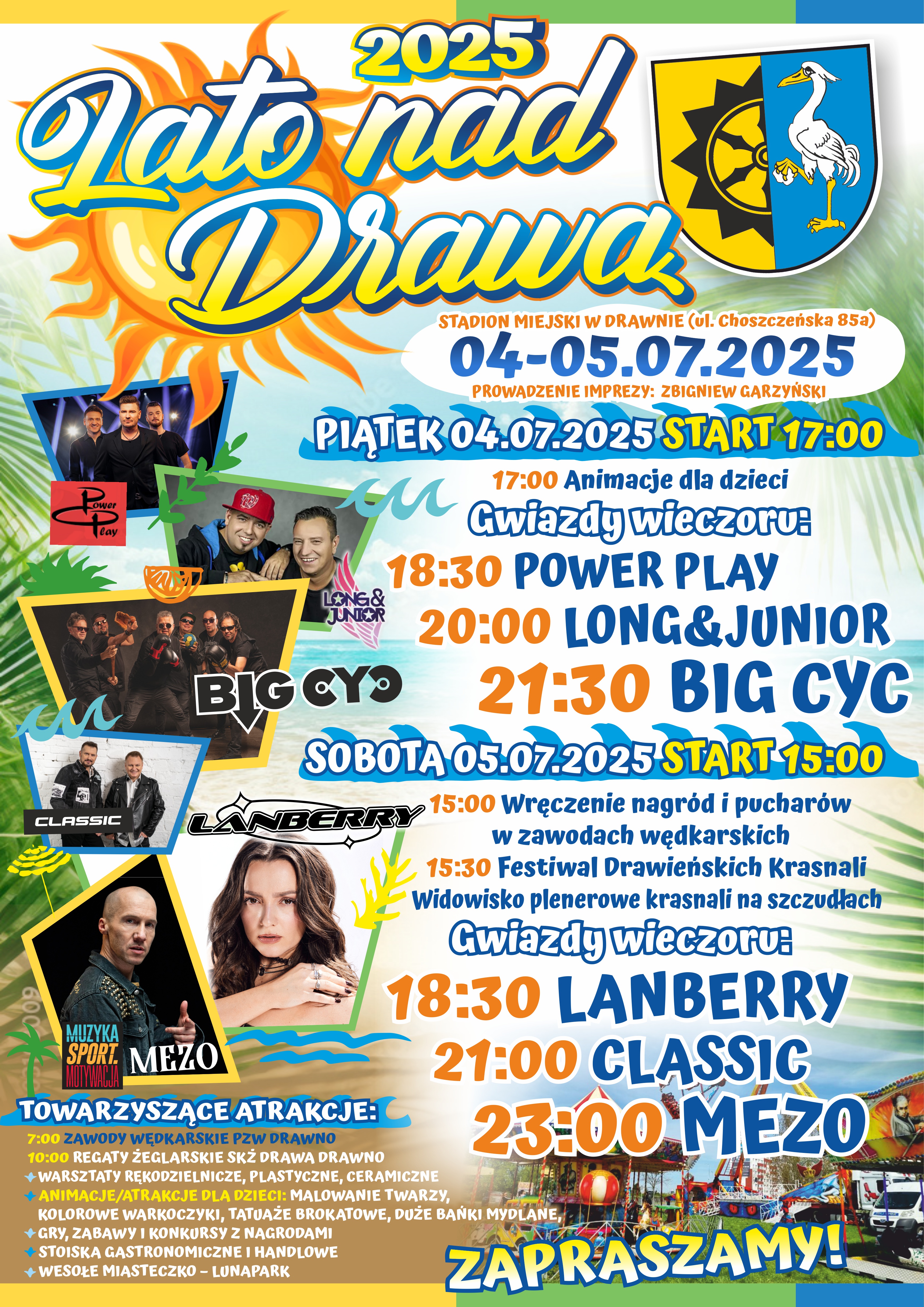 Lato nad Drawą 2025 – Drawno zaprasza na wspólne rozpoczęcie lata! ???? 4–5 lipca 2025 ???? Stadion Miejski w Drawnie Już 4 i 5 lipca zapraszamy serdecznie na Lato nad Drawą 2025! Przez dwa dni Stadion Miejski w Drawnie zamieni się w tętniącą życiem przestrzeń pełną atrakcji dla całych rodzin. W programie znajdziecie m.in.: ???? Zawody wędkarskie PZW oraz regaty żeglarskie – gratka dla miłośników aktywnego wypoczynku na wodzie. ???? Warsztaty rękodzielnicze, plastyczne i ceramiczne – kreatywne zajęcia dla dużych i małych! ???? Animacje dla dzieci – gry, zabawy i niespodzianki przez cały dzień. ???? Stoiska gastronomiczne i foodtrucki – pyszności z różnych stron świata. Wieczory to czas na koncerty z udziałem znanych i lubianych gwiazd polskiej sceny muzycznej! ???? 04 lipca (piątek) Power Play Long & Junior BIG CYC ???? 05 lipca (sobota) Lanberry Classic Mezo Nie przegap rozpoczęcia lata nad Drawą! Wstęp wolny – zabierz rodzinę i znajomych, i baw się z nami!