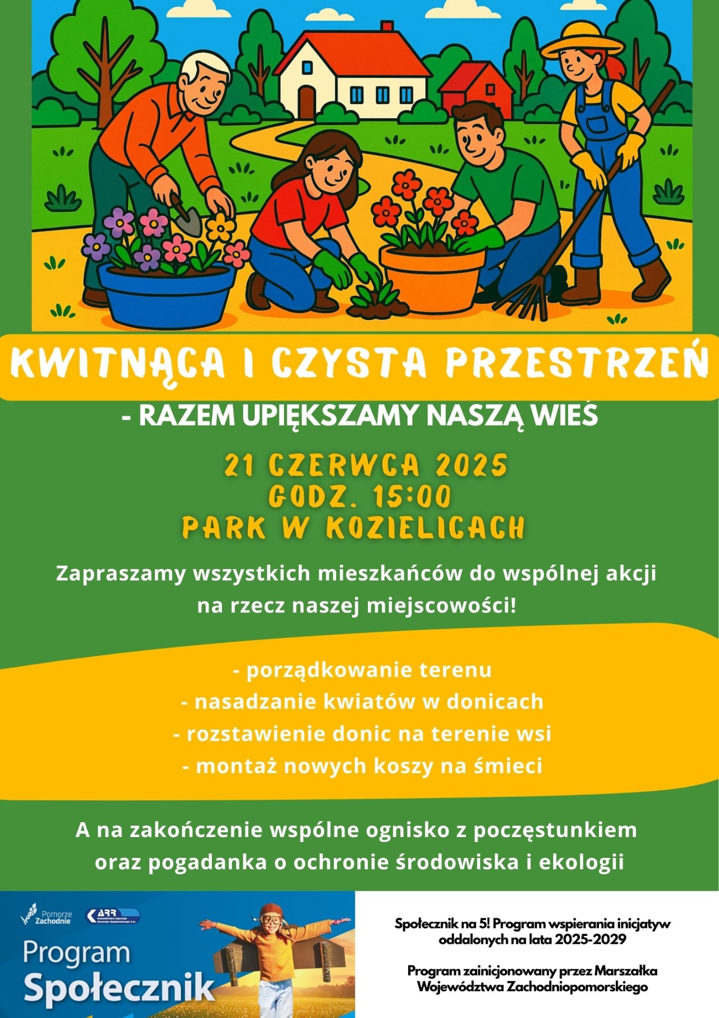 Drodzy Mieszkańcy! ???????? Już 21 czerwca (sobota) o godz. 15:00 spotykamy się w parku w Kozielicach, by wspólnie zadbać o naszą okolicę! W planie: ✅ porządkowanie terenu ✅ sadzenie kwiatów i rozstawianie donic ✅ montaż koszy na śmieci ???? Na zakończenie – ognisko z poczęstunkiem i krótka pogadanka o ochronie środowiska ???? Do zobaczenia!