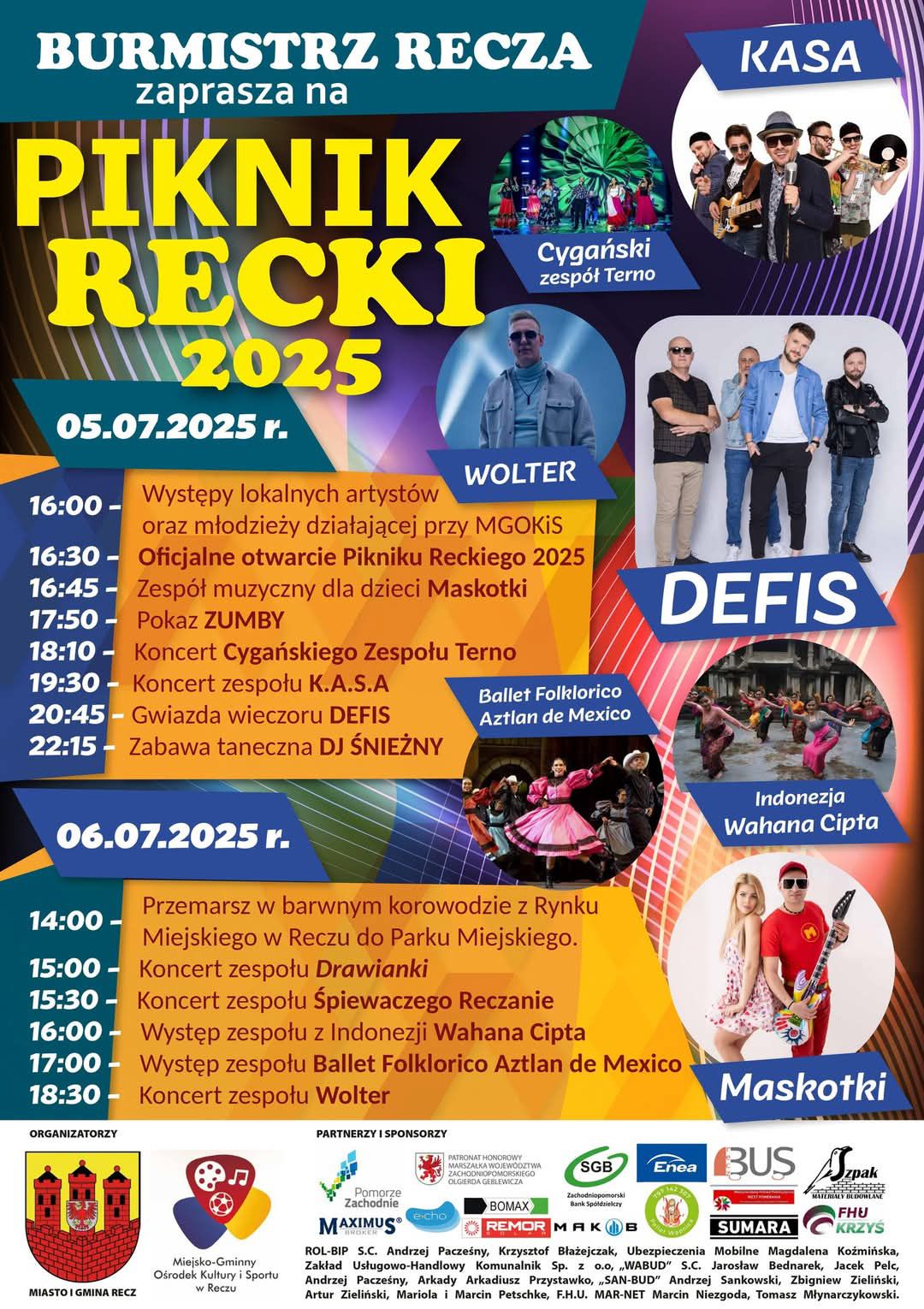 5 lipca zapraszamy na koncerty: - zespół K.A.S.A - zespół DEFIS -cygański zespół TERNO Dodatkowo występy lokalnych artystów, animacje, gry i zabawy dla najmłodszych, stoiska wystawiennicze, pyszne jedzonko 6 lipca: -w ranach Międzynarodowego Festiwalu Folklorystycznego WEST POMERANIA wystąpią: - Ballet Folklorico Aztlan de Mexico - Wahana Cipta z Indonezji