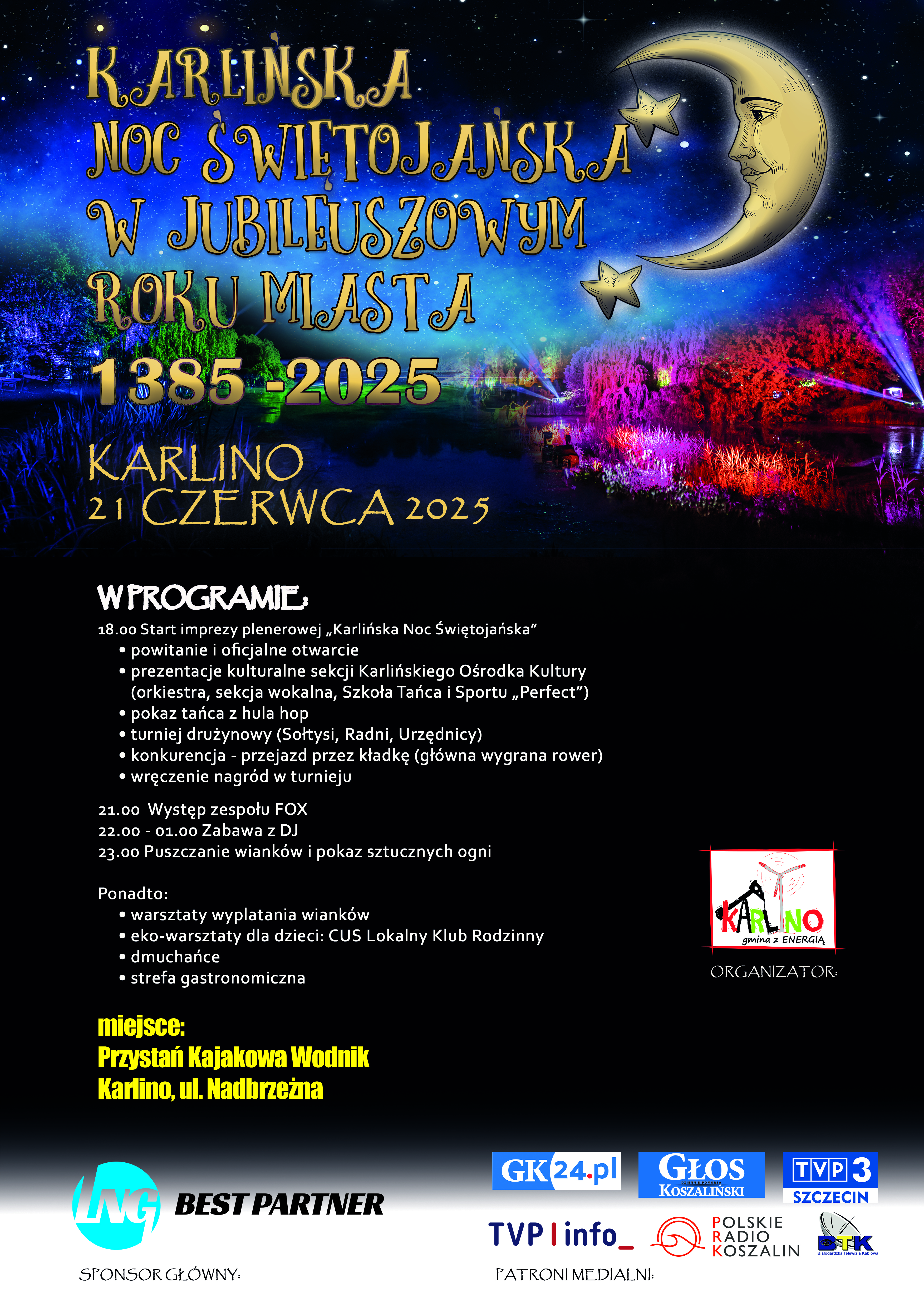 Karlino to gmina, która tętni życiem dzięki swoim mieszkańcom i dynamicznym inicjatywom. Dbamy o kultywowanie lokalnych tradycji, organizując wydarzenia o charakterze kulturalnym i sportowym, które przyciągają uczestników nie tylko z naszego regionu, ale i z całej Polski. Jednym z naszych najbardziej rozpoznawalnych przedsięwzięć jest Karlińska Noc Świętojańska – wydarzenie, które każdego roku gromadzi miłośników kultury, sportu i dobrej zabawy na świeżym powietrzu. Tegoroczna edycja odbędzie się 21 czerwca 2025 roku na przystani kajakowej Wodnik w Karlinie przy ul. Nadbrzeżnej. Program wydarzenia od godziny 18:00: - Powitanie i oficjalne otwarcie imprezy - Prezentacje artystyczne sekcji Karlińskiego Ośrodka Kultury: orkiestra, sekcja wokalna, Szkoła Tańca i Sportu „Perfect” - Pokaz tańca z hula-hop - Turniej drużynowy z udziałem sołtysów, radnych i urzędników - Konkurs „Przejazd przez kładkę” – główna nagroda: rower - Wręczenie nagród O 21:00 koncert zespołu FOX ???? Od 22:00 do 1:00 – zabawa taneczna z DJ-em ???? O 23:00 – puszczanie wianków i pokaz sztucznych ogni ???? Dodatkowe atrakcje: - Warsztaty wyplatania wianków - Eko-warsztaty dla dzieci prowadzone przez CUS – Lokalny Klub - Rodzinny - Dmuchańce dla najmłodszych - Strefa gastronomiczna Zapraszamy na wyjątkową edycję Karlińskiej Nocy Świętojańskiej, która w tym roku wpisuje się w obchody 640-lecia nadania praw miejskich naszej miejscowości.