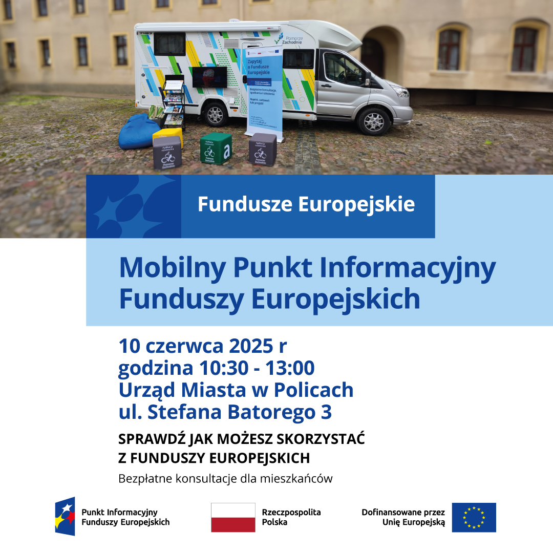 Główny Punkt Informacyjny Funduszy Europejskich w Szczecinie serdecznie zaprasza na Mobilny Punkt Informacyjny w Moryniu. Wydarzenie odbędzie się w ramach akcji promocyjnej regionu oraz Funduszy Europejskich pn. „Funduszowe Wtorki w Twoim mieście – odkryj możliwości Funduszy Europejskich!”. Podczas Mobilnego Punktu Informacyjnego udzielane są bezpłatne konsultacje ze specjalistą ds. Funduszy Europejskich dotyczące m.in.: pozyskania środków na otwarcie działalności gospodarczej, dotacji i pożyczek na rozwój prowadzonej działalności gospodarczej, finansowanie kursów i szkoleń zmierzających do podniesienia kwalifikacji zawodowych, zasady pozyskania dofinansowania, aktualne i przyszłe ogłoszenia o naborach wniosków, informacje o projektach i wydarzeniach regionu. Kiedy 24 czerwca 2025 r. w godz. 10:30 – 13:00 Gdzie: Plac Wolności 1 w Moryniu. konsultacje przy dużym aucie z logo: Pomorze Zachodnie Dla kogo? Spotkanie skierowane jest do wszystkich osób zainteresowanych pozyskaniem informacji nt. Funduszy Europejskich. Organizator spotkania Główny Punkt Informacyjny Funduszy Europejskich w Szczecinie ul. Marszałka Józefa Piłsudskiego 40, 70-421 Szczecin e-mail: pife.szczecin@wzp.pl