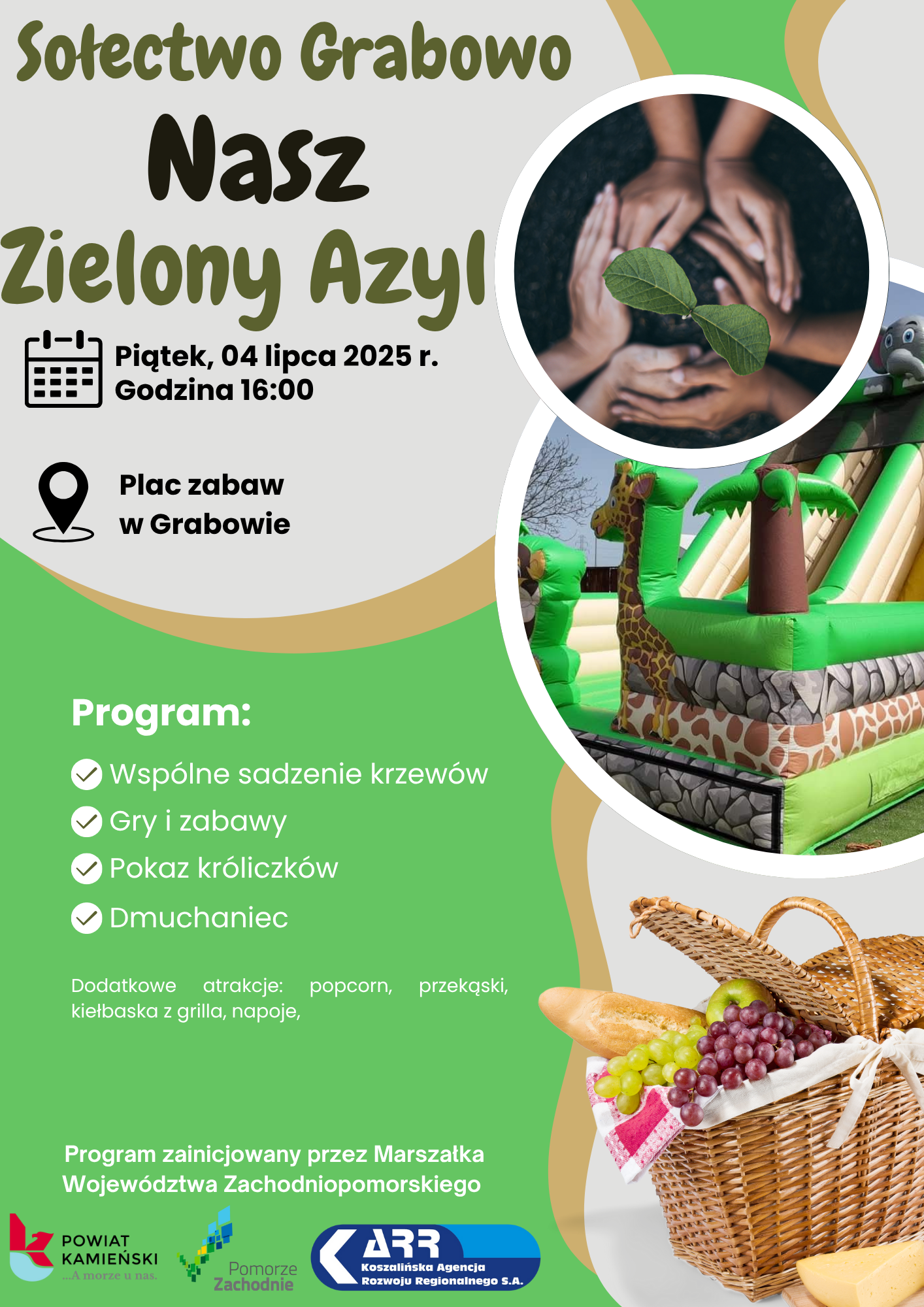 Zapraszamy na wydarzenie "Sołectwo Grabowo - Nasz Zielony Azyl"! W piątek, 4 lipca br. spotykamy się na placu zabaw w Grabowie, by wspólnie zadbać o naszą przestrzeń i świetnie się bawić! Start o godzinie 16:00! W programie: - wspólne sadzenie krzewów - gry i zabawy dla dzieci - pokaz króliczków - dmuchaniec A do tego pyszny poczęstunek: popcorn, przekąski, napoje i grillowana kiełbaska! Organizatorzy: Stowarzyszenie Przyjaciół Powiatu Kamieńskiego, Sołtys oraz Rada Sołecka Sołectwa Grabowo Do zobaczenia!