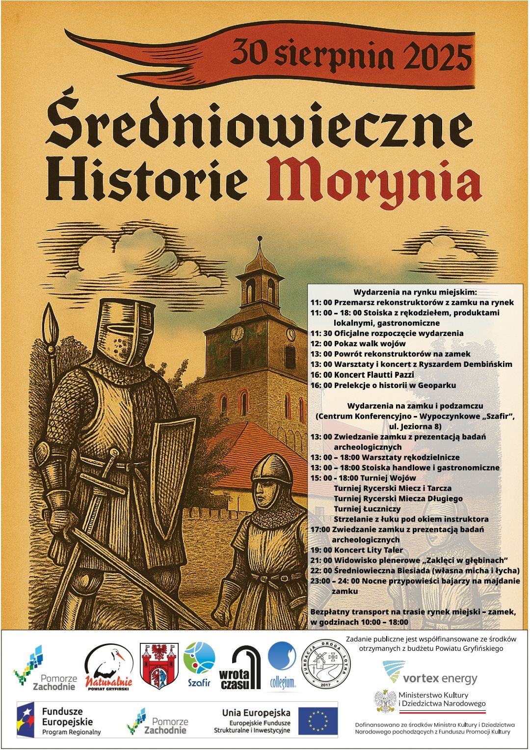 Gmina Moryń, Miejski Ośrodek Kultury w Moryniu, Fundacja Droga Lotha oraz TWR Collegium zapraszają na wydarzenie "Średniowieczne Historie Morynia 2025", które odbędzie się 30 sierpnia 2025 r. na rynku miejskim w Moryniu oraz na zamku i podzamczu (teren CKW "Szafir", ul. Jeziorna 8) od godziny 11:00. Wydarzenia na rynku miejskim: 11:00-18:00 - stoiska z rękodziełem, produktami lokalnymi, gastronomiczne 11:00 - Przemarsz rekonstruktorów z zamku na rynek 11:30 - OFICJALNE ROZPOCZĘCIE WYDARZENIA 12:00 - Pokaz walk wojów 13:00 - Powrót rekonstruktorów na zamek 13:00 - Warsztaty z Ryszardem Dembińskim 16:00 - Koncert zespołu muzyki dawnej Flauti Pazzi 16:00 - Prelekcje o historii w Geoparku Wydarzenia na zamku i podzamczu: 13:00 - 18:00 - Warsztaty rękodzielnicze, stoiska handlowe i gastronomiczne 13:00 - Zwiedzanie zamku z prezentacją badań archeologicznych 15:00 - 18:00 - Turniej Wojów, Turniej Rycerski Miecz i Tarcza, Turniej Rycerski Miecza Długiego, Turniej Łuczniczy, Strzelanie z łuku pod okiem instruktora 17:00 - Zwiedzanie zamku z prezentacją badań archeologicznych 19:00 - Koncert zespołu Lity Taler 21:00 - Widowisko plenerowe "Zaklęci w głębinach" 22:00 - Średniowieczna Biesiada (własna micha i łycha) 23:00 - 24:00 - Nocne przypowieści bajarzy na majdanie zamku W ramach wydarzenia otwarty będzie również Moryński Młyn Wodny, gdzie będzie można poznać jego historię oraz podzielić się własnymi wspomnieniami z członkami stowarzyszenia, które opiekuje się zabytkiem. Ponadto, w godzinach 10:00-18:00 będzie możliwość skorzystania z bezpłatnego transportu na trasie rynek miejski - zamek.
