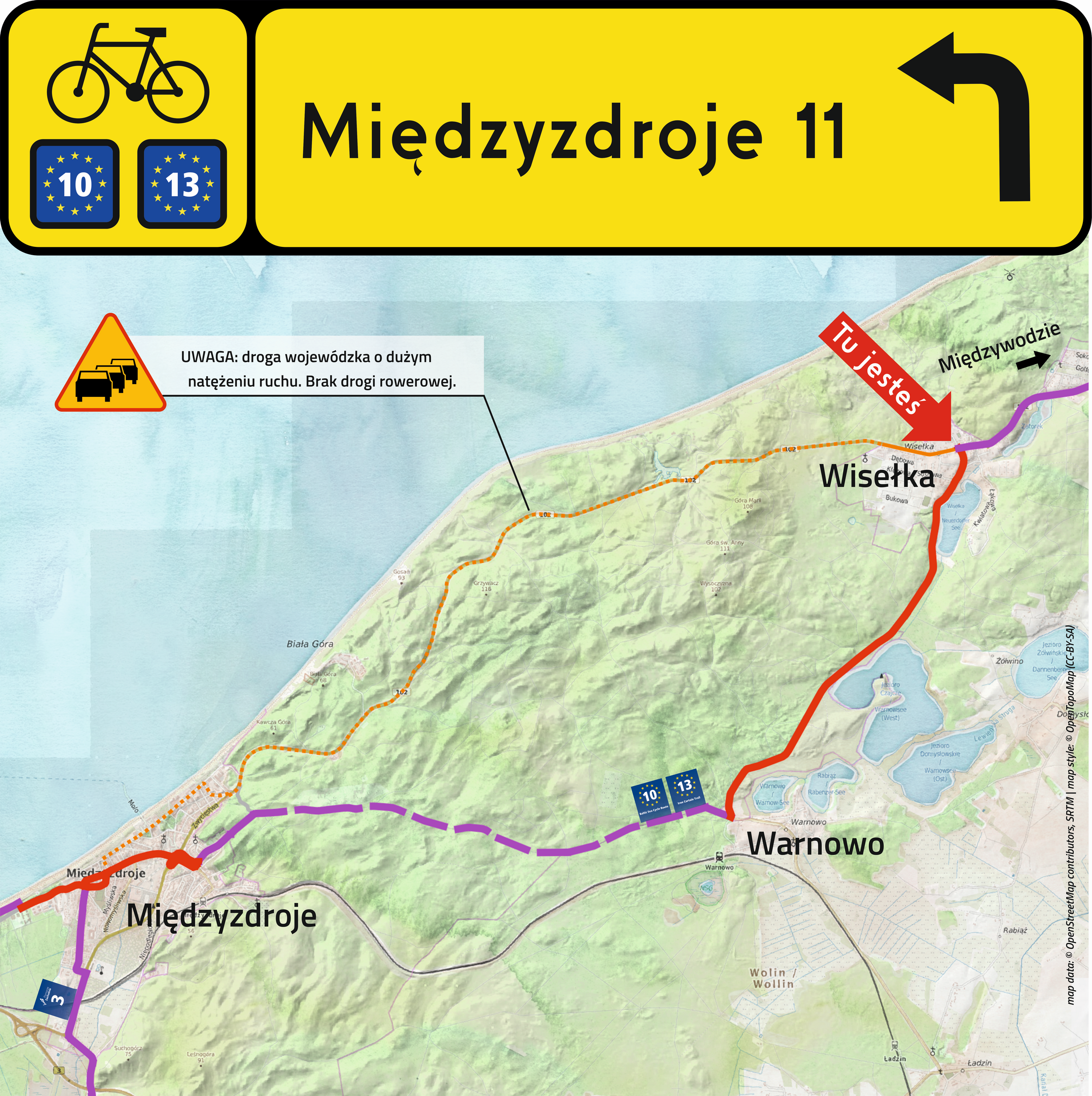 Wzdłuż drogi wojewódzkiej 102 droga dla rowerów jest w fazie projektowej, jazda odbywa się w ruchu ogólnym z samochodami. Jadąc do Międyzdrojów zachęcamy do skorzystania z objazdu ul. Warnowską i Wolińskim Parkiem Narodowym oraz korzystanie z elektronicznych map.
