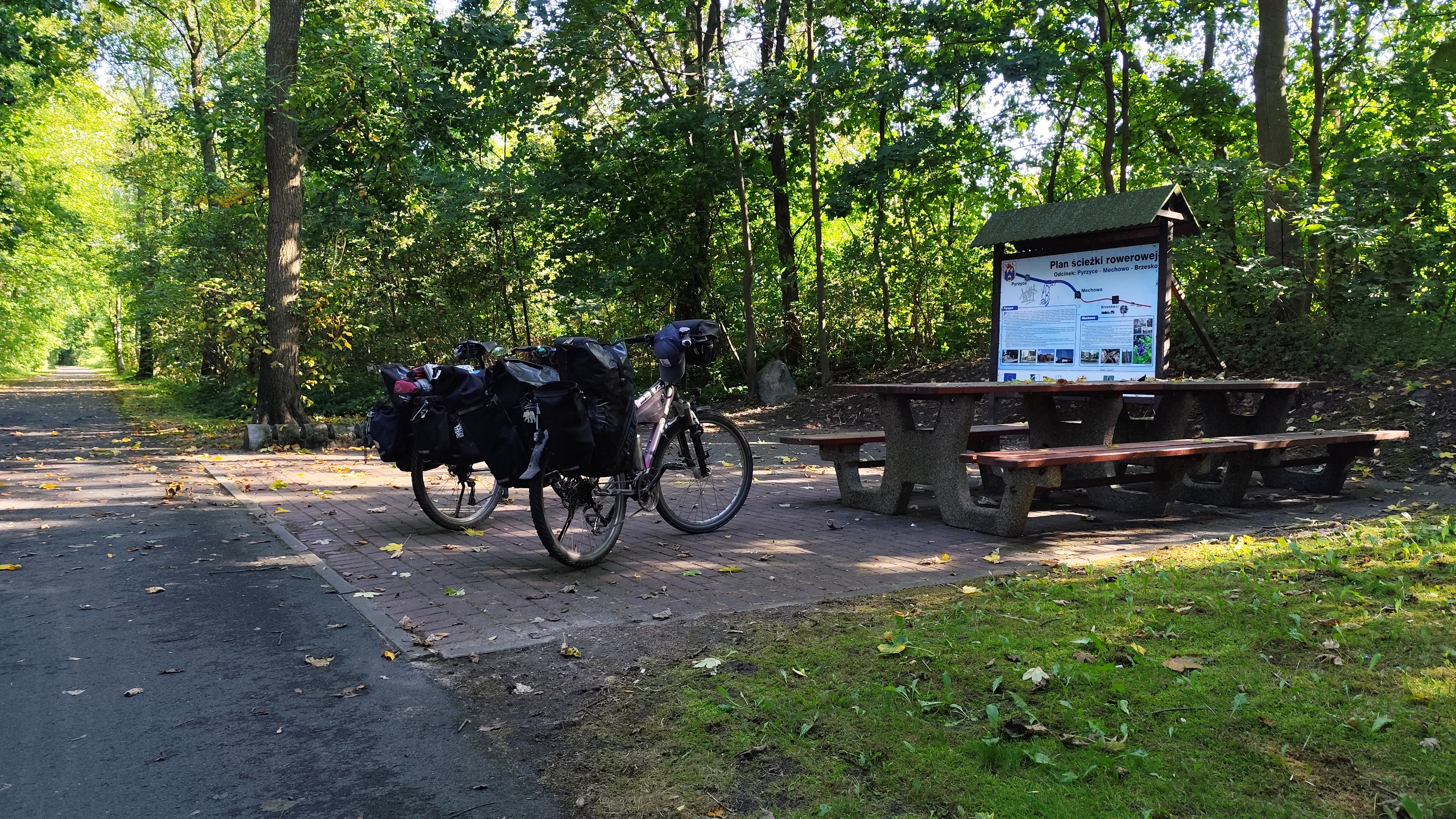 Zacieniony przystanek rowerowy z kilkoma stołami położony w miejscu dawnej stacji Mechowo.