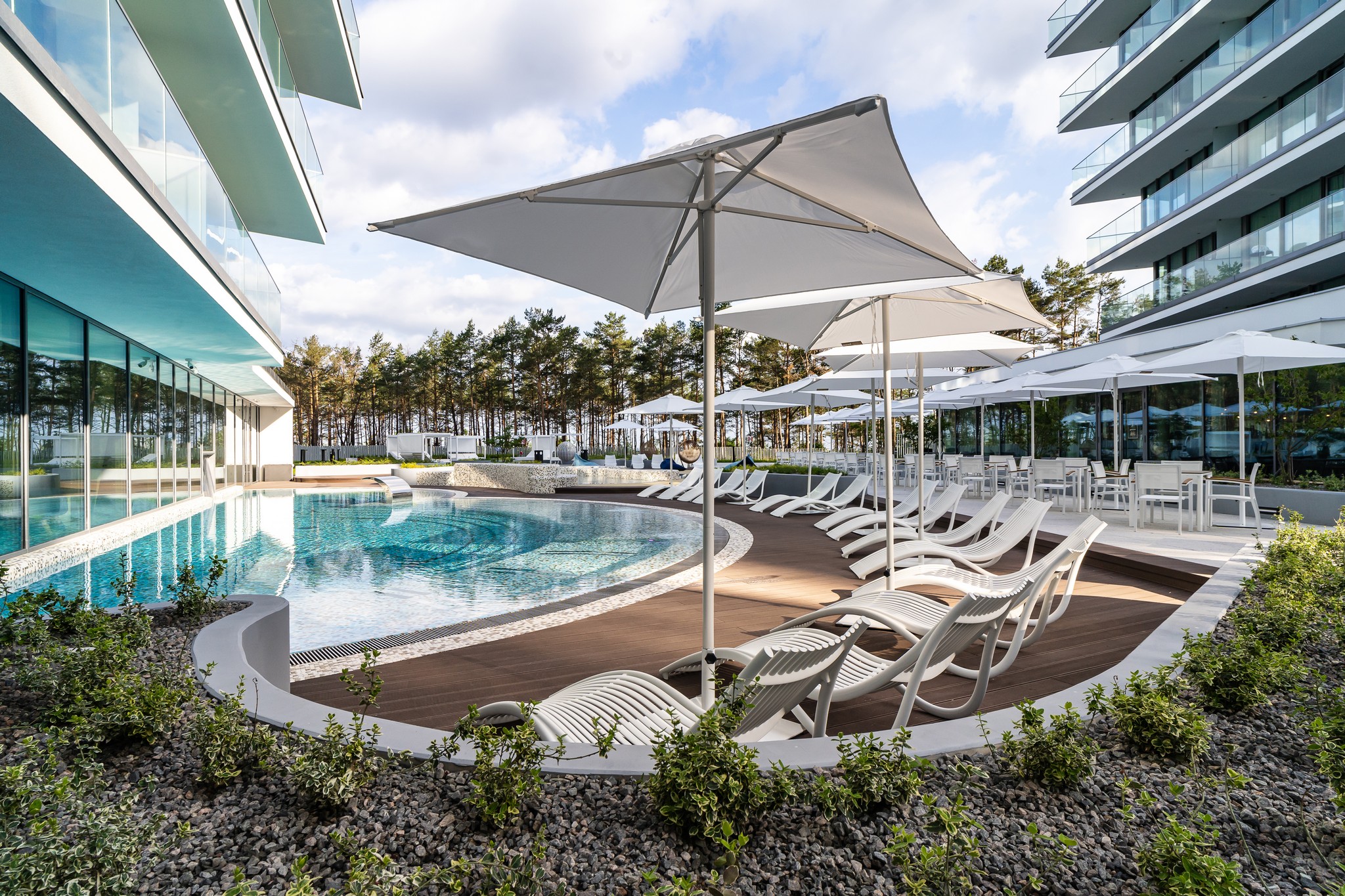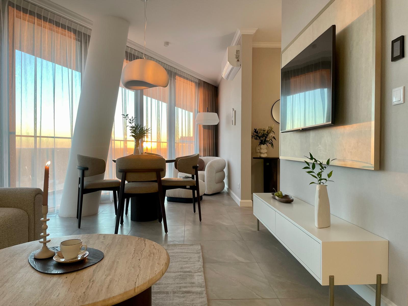 Luksusowe apartamenty 2- i 3-pokojowe w Wave Międzyzdroje Resort & SPA to prawdziwe dzieła sztuki, w których każdy element nawiązuje do otaczającej natury. Z przestronnych balkonów rozciąga się zapierający dech w piersiach widok na morze, wydmy i przepiękny park sosnowy. W apartamentach uwagę zwracają ręcznie wykonane drewniane rzeźby, przypominające kawałki drewna wyrzuconego przez morze na brzeg. Mosiężne uchwyty w kształcie kamieni oraz delikatne pióra dopełniają klimatu wnętrz. Na najwyższych kondygnacjach kompleksu dostępne są również prestiżowe apartamenty na sprzedaż – Sky Premium z panoramicznym widokiem na Bałtyk.