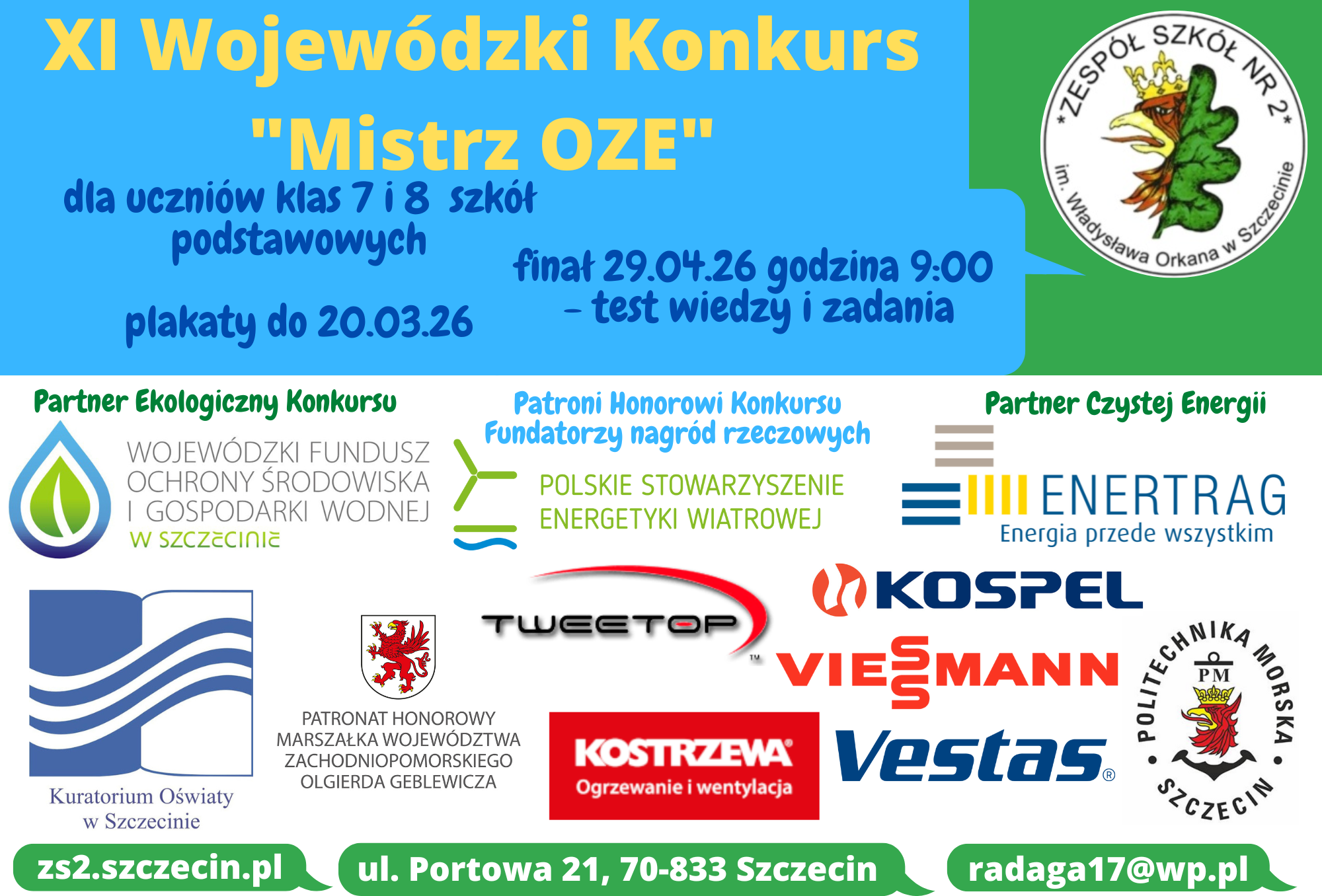Przed nami wyjątkowa edycja Wojewódzkiego Konkursu Mistrz OZE, a to za sprawą bardzo życzliwych odpowiedzi różnych instytucji i firm gotowych do ufundowania atrakcyjnych nagród dla uczestników. Wzorem ubiegłych lat, każdy uczestnik opuści finał z upominkiem. Czekamy na odpowiedź Kuratorium Oświaty i informację o dodaniu konkursu do wykazu zawodów punktowanych przy naborze do szkół średnich. Adresatami konkursu są uczniowie 7 i 8 klas szkół podstawowych z województwa zachodniopomorskiego. Konkurs obejmuje trzy etapy: I - plakat na wybrany temat, który należy wysłać do 20 marca 2026 r. I tu niespodzianka, ENERTRAG dołącza jako Partner Czystej Energii i wyróżni najciekawsze plakaty edukacyjne (dodatkowo poza wynikami etapu II i III) na temat: Charakterystyki siłowni wiatrowych i systemów fotowoltaicznych za pomocą nagród rzeczowych i na łamach międzynarodowych profili społecznościowych ENERTRAG (Linkedln, Facebook, Instagram). II - test wiedzy III - zadania obliczeniowe. Dwa ostatnie etapy odbędą się tego samego dnia - 29 kwietnia 2026 r. (w naszej szkole). Regulamin dostępny na naszej stronie internetowej. Zapraszamy. http://zs2.szczecin.pl/technikum/aktualnosci/XI-Wojewodzki-Konkurs-Mistrz-OZE_2514
