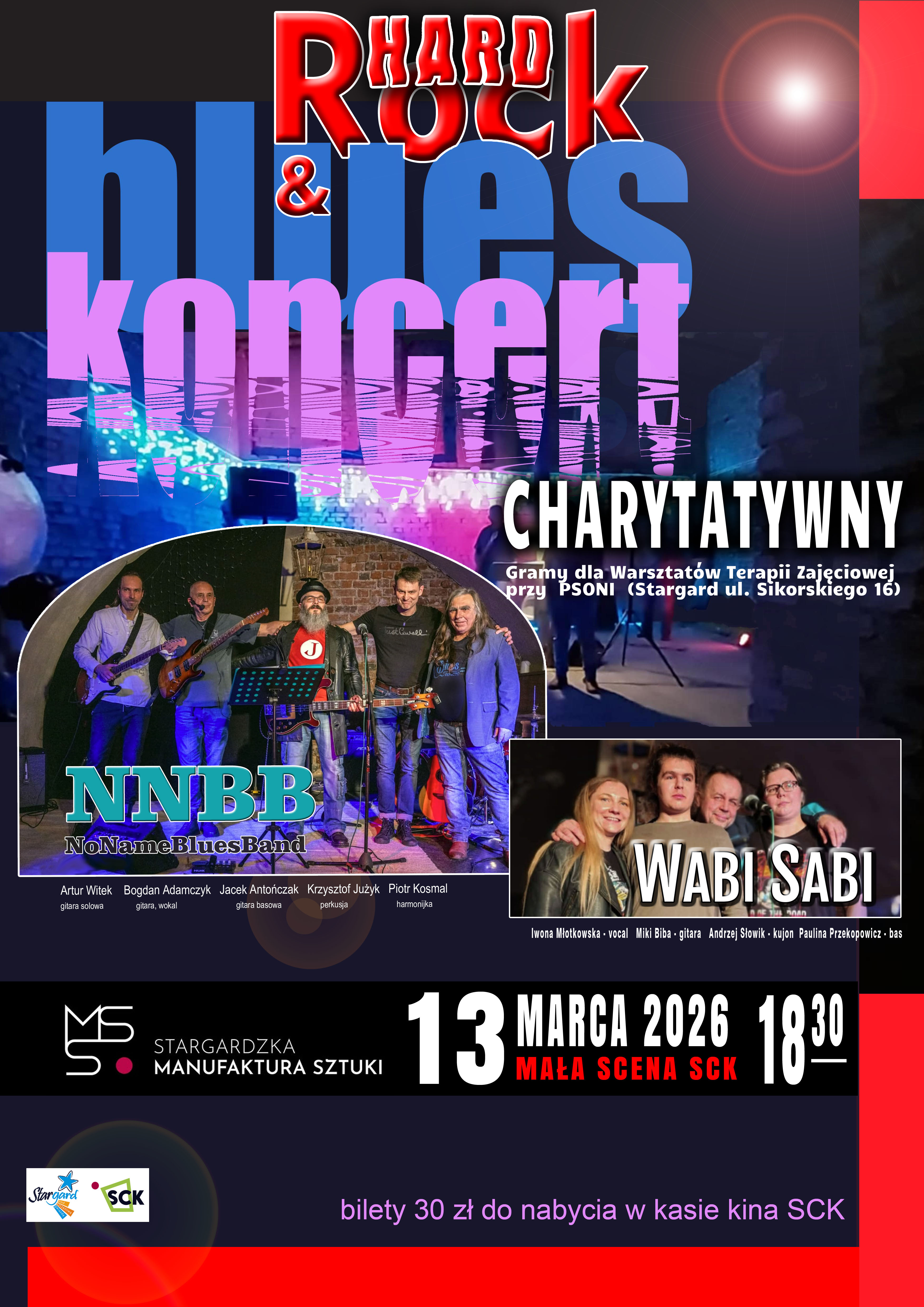 Już 13 marca 2026 roku scena SCK ponownie stanie się przestrzenią spotkania różnych muzycznych światów. To kolejna edycja wydarzenia realizowanego w ramach Stargardzkiej Manufaktury Sztuki, które łączy artystyczną różnorodność, energię na żywo i ideę wspólnego działania. Tego wieczoru będzie ostrzej, będzie zmysłowo, a przede wszystkim – będzie intensywnie. Na jednej scenie spotkają się dwa odmienne gatunki muzyczne, tworząc wyjątkowe połączenie brzmień i emocji. Publiczność rozgrzeją: Wabi Sabi – bezkompromisowa energia i mocne dźwięki No Name Blues Band – bluesowa zmysłowość i muzyczna głębia Ten koncert to nie tylko muzyczne przeżycie. Wszyscy wykonawcy przekażą cały dochód z wydarzenia na cele charytatywne (Wartsztaty Terapii Zajęciowej przy PSONI), czyniąc Manufakturę Sztuki także strefą wsparcia.