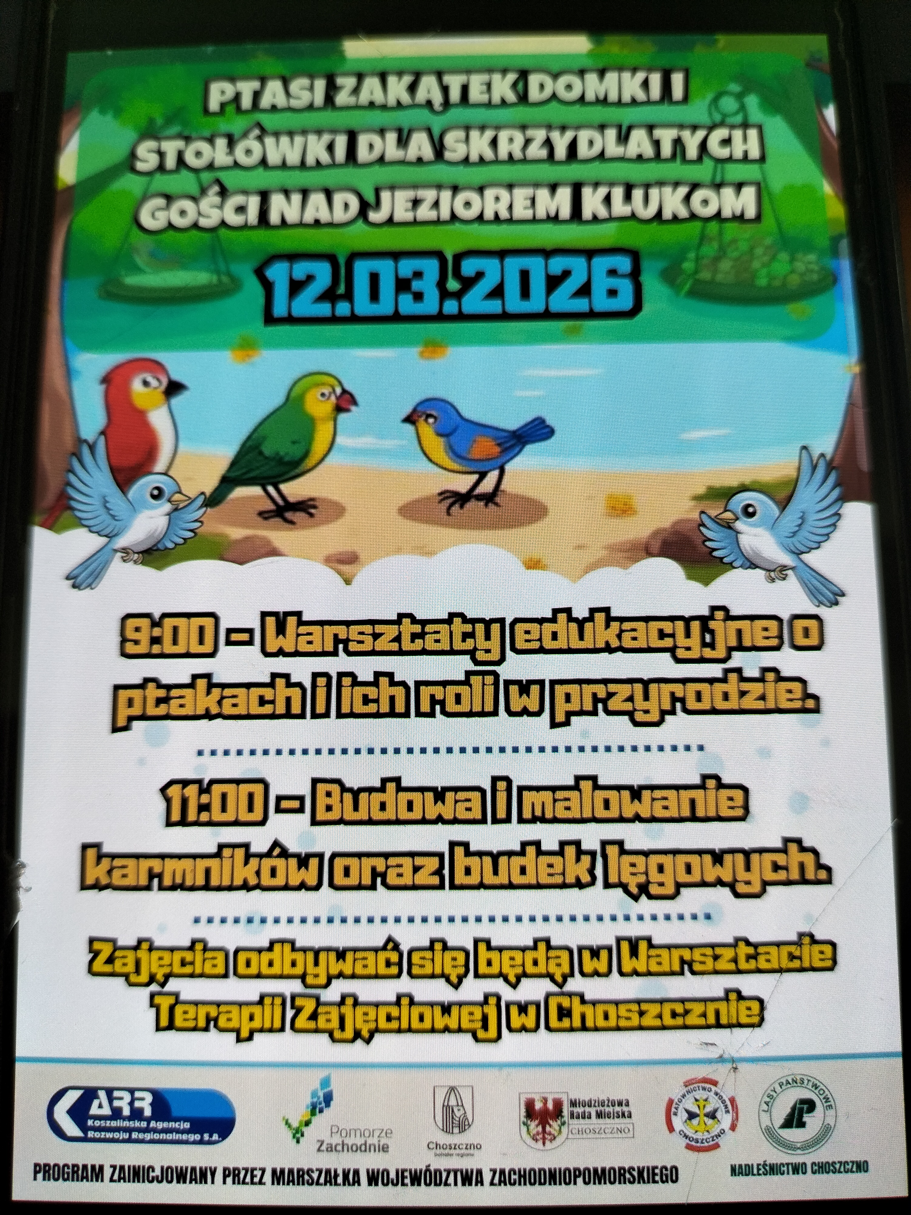 9:00 - Warsztaty edukacyjne o ptakach ich roli w przyrodzie. 11:00 - Budowa i malowanie karmników oraz budek lęgowych. Zajęcia odbywają się przy współpracy z Warsztat Terapii Zajęciowej, Nadleśnictwa Choszczno i JRW Choszczno. Zajęcia odbywają się w Warsztat Terapii Zajęciowej w Choszcznie.