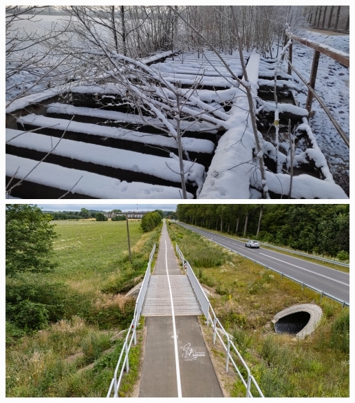 Dalej najstarsza tego typu droga rowerowa w polsce prowadzi spokojnie przez pola i lasy Drawskiego Parku Krajobrazowego, mijając dawne stacje i miejsca odpoczynku w Zajączkowie, Toporzyku oraz Chlebowie. Po drodze pojawiają się tajemnicze pozostałości niedokończonej autostrady „Berlinka” Mającej Połączyć Berlin z Królewcem, przez Szczecin i Gdańsk. Dalej zjeżdżamy kilkaset metrów do Cieszyna z pałacem nad jeziorem Cieszyno z krystalicznie czystą wodą, gdzie możemy chwilę odpocząć.