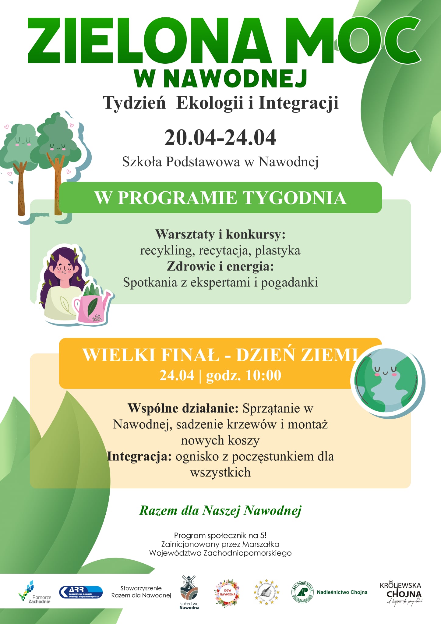 Serdecznie zapraszamy dzieci, młodzież oraz mieszkańców Nawodnej na „Tydzień Ekologii i Integracji” – cykl wydarzeń promujących zdrowy styl życia, troskę o środowisko i wspólne działanie. W programie m.in. konkursy plastyczne, techniczne i fotograficzne, spotkanie z dietetykiem, konkurs recytatorski oraz warsztaty z recyklingu. Finałem wydarzenia będzie wspólne Święto Ziemi – sprzątanie miejscowości, sadzenie krzewów, montaż ławek i koszy, a także integracyjne ognisko z poczęstunkiem i wręczeniem nagród. Dołącz do nas i razem zadbajmy o Nawodną!