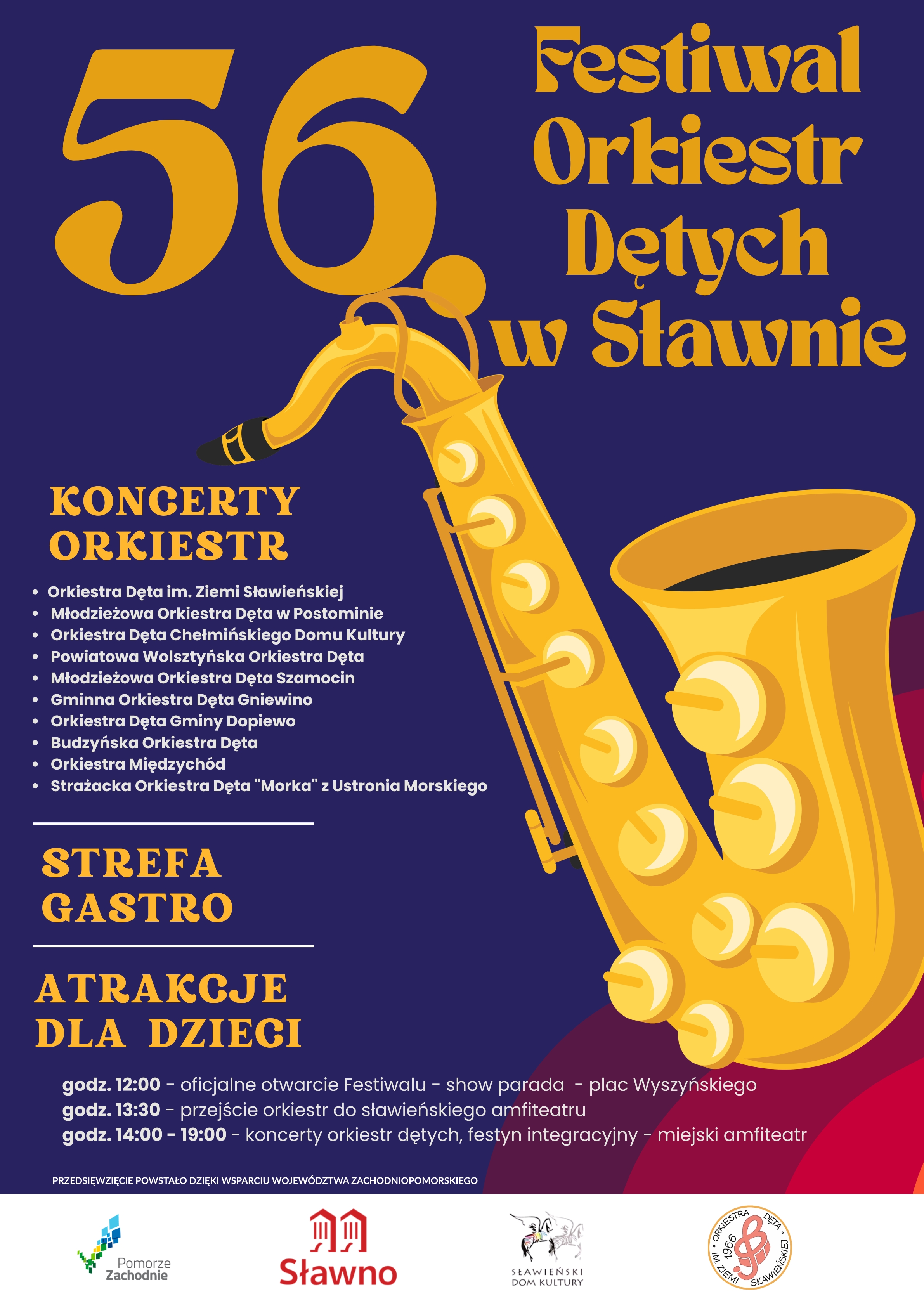 Już 24 maja 2026 roku zapraszamy mieszkańców oraz gości na wyjątkowe wydarzenie muzyczne – 56. Festiwal Orkiestr Dętych w Sławnie. Festiwal Orkiestr Dętych w Sławnie to najstarszy festiwal orkiestr dętych w Polsce, którego historia sięga 10 czerwca 1969 roku. Z biegiem lat wydarzenie zyskało rangę międzynarodową i dziś należy do największych imprez kulturalnych w północnej części kraju. Festiwal ma charakter cykliczny i jest organizowany wspólnie przez Urząd Miejski w Sławnie, Sławieński Dom Kultury oraz Orkiestrę Dętą im. Ziemi Sławieńskiej. Gromadzi zespoły z różnych regionów Polski i zagranicy, które prezentują swoje umiejętności podczas widowiskowych parad ulicznych oraz koncertów estradowych w miejskim amfiteatrze. Głównym celem wydarzenia jest popularyzacja muzyki orkiestr dętych, promocja dorobku artystycznego zespołów oraz integracja środowiska muzycznego i lokalnej społeczności. Festiwal odgrywa również istotną rolę w promocji miasta i regionu, wspiera rozwój kultury muzycznej oraz stwarza przestrzeń do wymiany doświadczeń między orkiestrami i młodymi muzykami. Stanowi przy tym atrakcyjną formę spędzania czasu dla mieszkańców i turystów, podkreślając lokalne tradycje i wzmacniając tożsamość kulturową regionu. Nadchodząca, 56. edycja Festiwalu będzie miała szczególny charakter. W 2026 roku Orkiestra Dęta im. Ziemi Sławieńskiej obchodzi bowiem jubileusz 60-lecia działalności. To wyjątkowa okazja do uhonorowania jej dorobku artystycznego oraz zaprezentowania bogactwa tradycji muzycznych regionu. W programie wydarzenia przewidziano m.in. uroczyste otwarcie festiwalu połączone z paradą orkiestr, przemarsz uczestników do amfiteatru, koncerty orkiestr dętych, festyn integracyjny, strefę gastronomiczną oraz atrakcje dla dzieci. Przedsięwzięcie powstało dzięki wsparciu Województwa Zachodniopomorskiego. Organizatorami wydarzenia jest Urząd Miejski w Sławnie, Orkiestra Dęta im. Ziemi Sławieńskiej oraz Sławieński Dom Kultury.