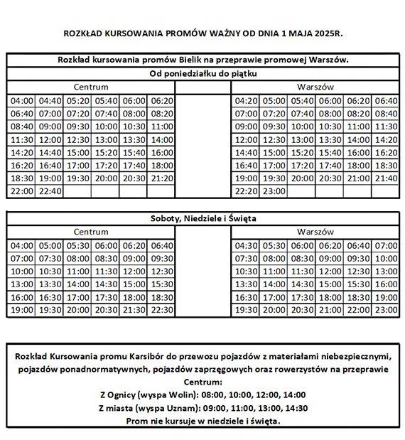 Przeprawa Promowa Centrum łączy dwie części Świnoujścia położone na wyspie Uznam i na Wyspie Wolin. Przeprawa Centrum do przewozu pojazdów z materiałami niebezpiecznymi, pnadnormatywnych oraz zaprzęgowych. Rozkład kursowania promu od dnia 1.05.2025 r.: