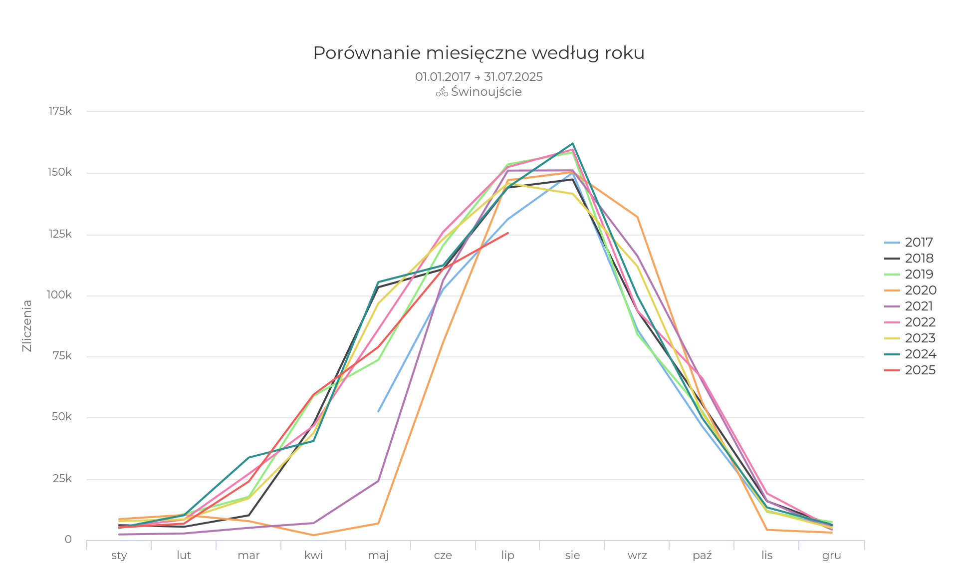 Licznik znajduje się na międzynarodowej trasie EuroVelo 10 i 13. Licznik został umiejscowiony na odcinku asfaltowej drogi rowerowej prowadzącej ze Świnoujścia do granicy polsko-niemieckiej i dalej do niemieckich kurortów wypoczynkowych. Nie jest to jedyne przejście graniczne w rejonie Świnoujścia, ale jest zdecydowanie najbardziej popularne - łączy ze sobą najwięcej celów i źródeł podróży, jest położone najbliżej morza oraz nie ma na nim ruchu samochodowego. Licznik znajduje się na ciągu pieszo-rowerowym, część rowerowa jest wyodrębniona nawierzchnią. Rowerzyści poruszający się po części pieszej nie są zliczani. Z uwagi na położenie przy dużym mieście, w dużym stopniu zliczany jest również ruch komunikacyjny.