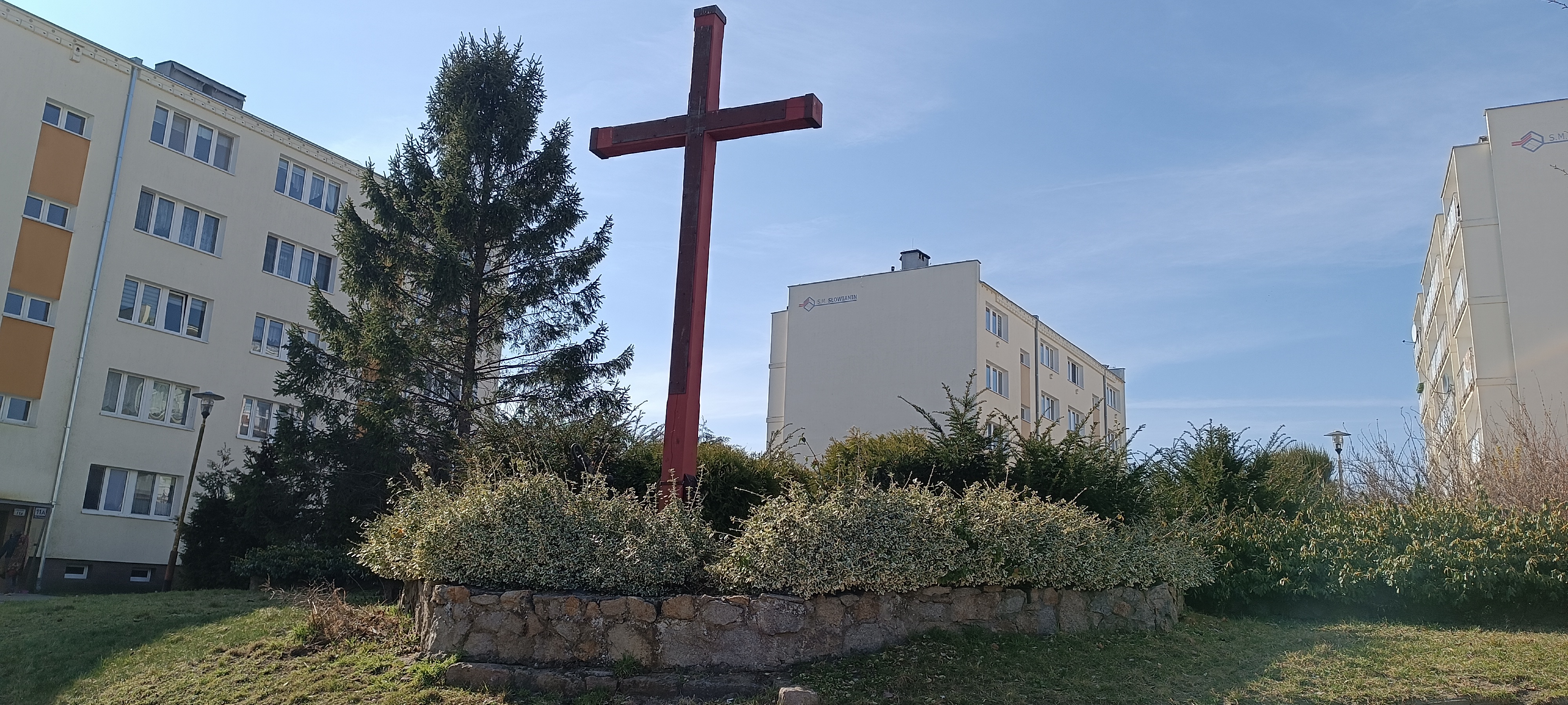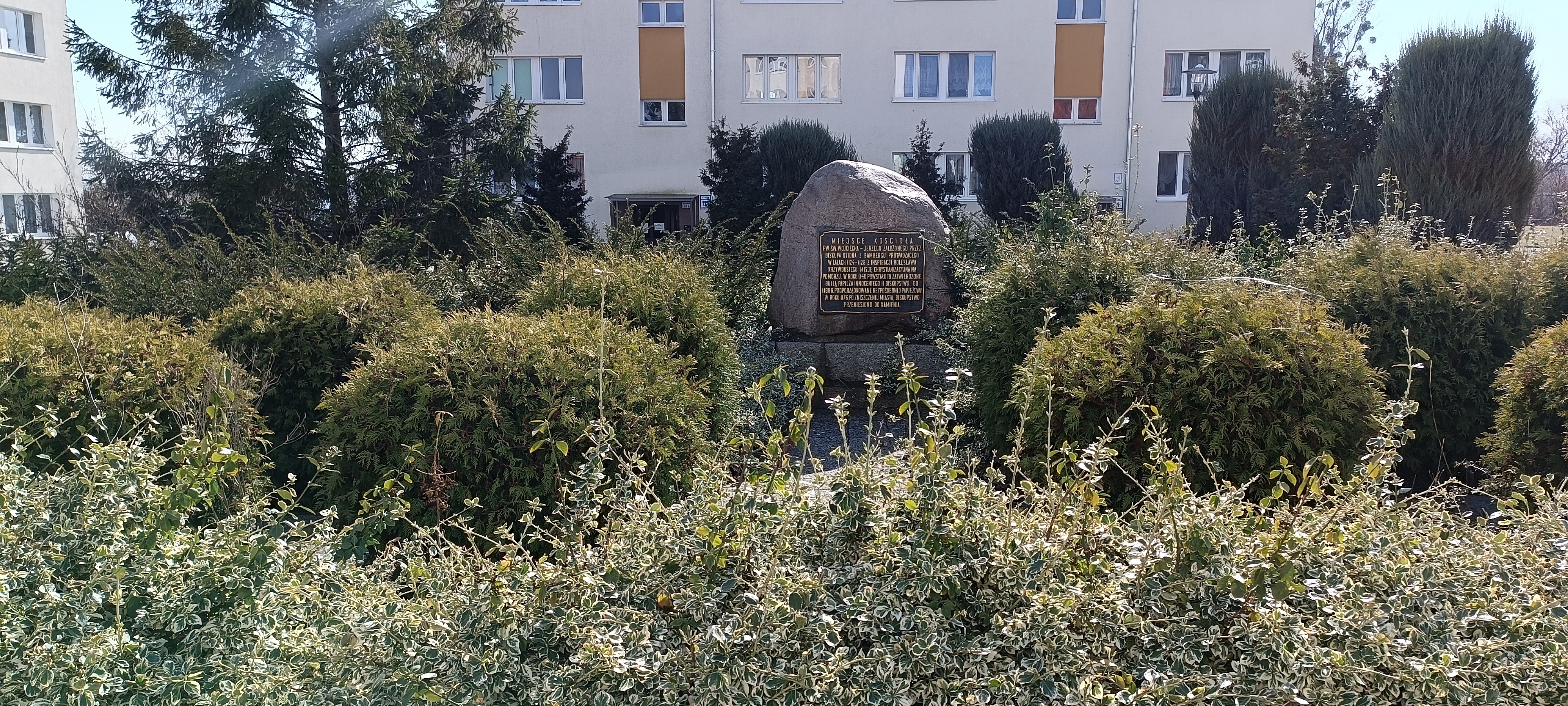 W miejscu kościoła pw. Jerzego Wojciecha, zniszczonego całkowicie podczas II wojny światowe, usytuowano pamiątkowy kamień. Kościół ten wzniesiony był na miejscu katedry, siedziby pierwszego biskupstwa na Pomorzu Zachodnim, powstałego w wyniku misji chrystianizacyjnej biskupa Bambergu Ottona na Pomorzu. W wyniku intensywnych najazdów duńskich na Wolin w połowie XII w. siedziba biskupstwa została przeniesiona do lepiej bronionego Kamienia Pomorskiego.