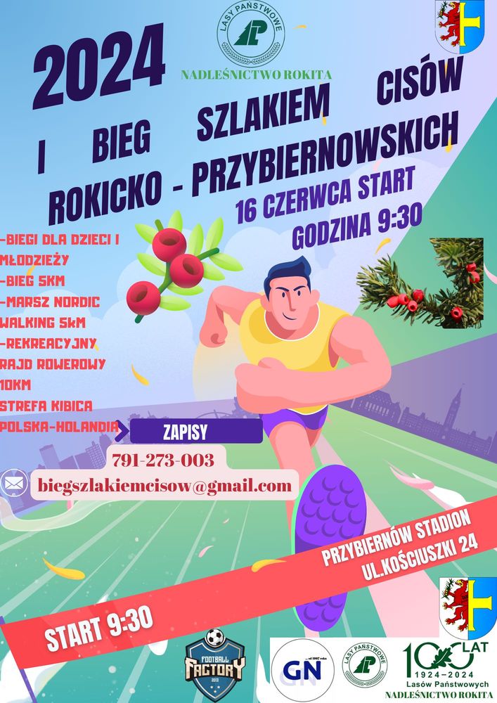 Można wystartować w następujących konkurencjach: bieg 5km Kategoria Open marsz nordic-walking 5km rekreacyjny rajd rowerowy 10km Bieg Przedszkolaka 250m Rocznik 2016/2015 400m Rocznik 2014/2013 600m Rocznik 2012/2011 800m Rocznik 2010/2009 800m Zgłoszenia i informacje szczegółowe: od dnia 30.04.2024 r. do dnia 10.06.2024r. do godz. 24:00 e-mail: biegszlakiemcisow@gmail.com Organizator: Tomasz Kobielski 791 273 003 Prawo startu w biegu i marszu nordic-walking mają osoby, które do dnia 16.06.2024r. ukończą 18 lat. Opłata startowa Ustala się następujące stawki opłat: Dla konkurencji bieg , marsz nordic walking, przejazd rowerowy : 45 zł do 1.06.2024r. 55 zł – pozostałe osoby, które dokonają zgłoszenia i opłaty startowej do dnia 10.06.24 r. ⏹Opłata startowa ????Bieg Przedszkolaka 250m ????Rocznik 2016/2015 400m ????Rocznik 2014/2013 600m ????Rocznik 2012/2011 800m ????Rocznik 2010/2009 800m 29zł do 1.06.2024r. 39zł do 10.06.2024r. W cenę pakietu wchodzi pamiątkowy medal worek gadżet Osoby urodzone w roku 1959 lub wcześniej, zwolnieni są z opłaty startowej (wymagany kontakt mailowy z organizatorem na adres e-mail: biegszlakiemcisow@gmail.com , tel. 791273003 po dokonaniu zapisu). Terminy startu poszczególnych konkurencji (16 czerwca 2024 roku, niedziela): ???? godz. 9:30 Zbiórka uczniów klasy 0-8 ???? godz. 9:45 Bieg Przedszkolaka ???? godz. 10:00 Bieg Rocznik 2015/2016 ???? godz. 10:15 Bieg Rocznik 2014/2013 ???? godz. 10:30 Bieg Rocznik 2012/2011 ???? godz. 10:45 Bieg Rocznik 2010/2009 ???? godz. 11:05 start uczestników rekreacyjnego rajdu rowerowego 10km, ???? godz. 11:10 start uczestników biegu 5km , ???? godz. 11:15 start uczestników marszu nordic-walking 5km , ⏹ Biuro zawodów Biuro zawodów będzie działało od godziny 8:30 16.06.2024 r. Szczegółowe godziny pracy biura zawodów podane zostaną w późniejszym terminie. W dniu 16.06.2024 r. (Niedziela) biuro zawodów I BIEG SZLAKIEM CISÓW Rokicko - Przybiernowskich zlokalizowane będzie na stadionie w Przybiernowie ul. Kościuszki 24