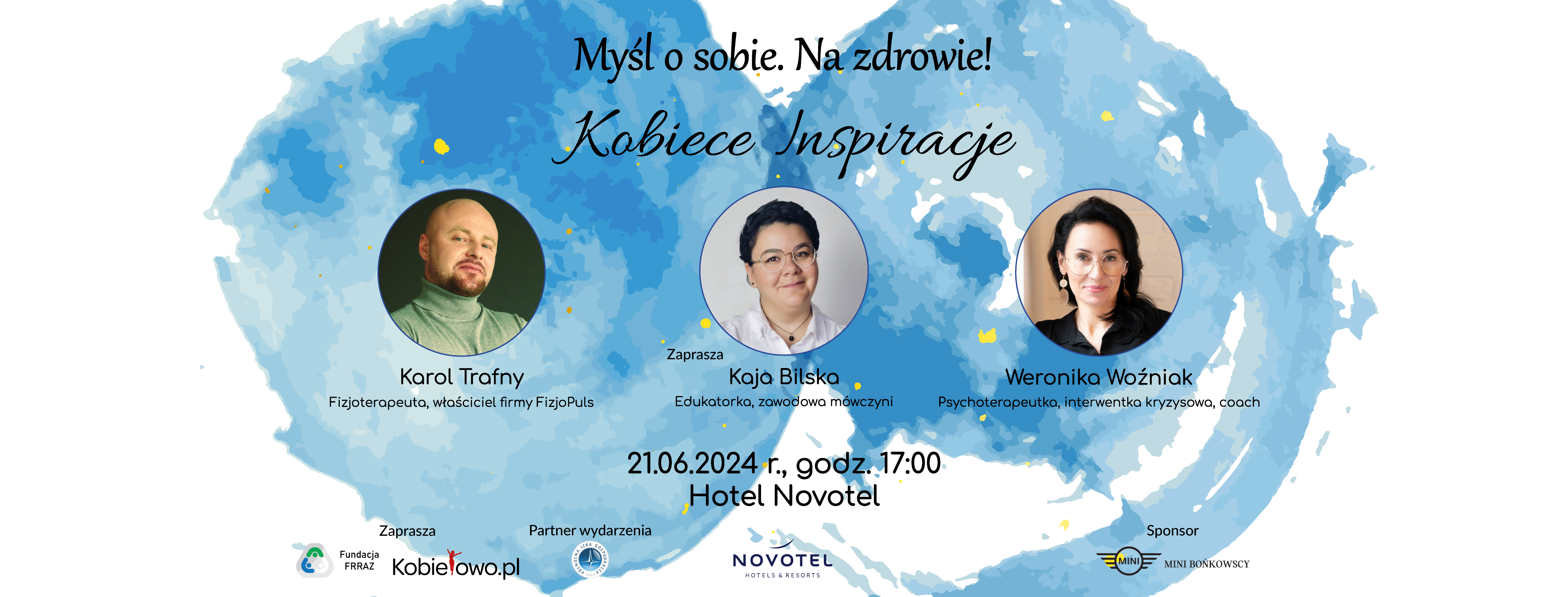 Szanowni Państwo, już 21.06.2024 Kobietowo.pl i Fundacja FRRAZ zapraszają na Spotkanie Kobiece Inspiracje vol.5 Kobiece Inspiracje to spotkanie Kobiet z innymi inspirującymi Kobietami ze świata biznesu, sztuki i kultury. Tutaj Panie mogą cieszyć się własnym towarzystwem oraz ofertą wystawców przygotowaną specjalnie dla nich. Idea piątkowych spotkań narodziła się z potrzeby pobycia ze sobą w przyjaznej atmosferze i szczerych rozmów na różne tematy. Gospodarz wydarzenia, Hotel Novotel zapewni uczestniczkom atrakcyjne zniżki na barze, na czas wydarzenia. Sponsorem główmy wydarzenia jest Mini Bońkowski Podczas spotkania Kobiece Inspiracje 21.06.2024, tematem przewodnim będzie "Myśl o sobie, na zdrowie" Panie będą mogły posłuchać: * Psychoterapeutki Weroniki Woźniak, z Psychocentrum w bloku pt. "Uzdrawiająca moc myśli czyli, jak zwiększyć swój dobrostan" * Powerspeech Kai Bilskiej pt. "DOBRA ENERG-JA! Odnajdź jej źródło w sobie" * Fizjoterapeuty Karola Trafnego FizjoPuls Gabinet Terapii pt. "W zdrowym ciele wielka MOC" Spotkanie zamknie niespodzianka szykowana dla uczestniczek. Agenda wydarzenia 17.00-18.00 Oferta dla Pań (wystawcy, drinki) 18.00-20.00 Prelekcje, panele dyskusyjne 20.00-22.00 Integracja ze zniżką od Gospodarza Zapisując się na wydarzenie zgadzasz się z Regulaminem. *Partnerem wydarzenia jest Północna Izba Gospodarcza w Szczecinie.