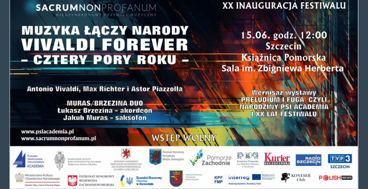 Tegoroczna XX edycja Festiwalu realizowana jest pod hasłem Muzyka łączy Narody - Arcydzieła Muzyki Filmowej i dedykowana jest ponownie cichym bohaterom wojny u naszych wschodnich sąsiadów - kobietom i dzieciom Ukrainy. W tym roku patronat honorowy nad Festiwalem objęli: Małgorzata Kidawa-Błońska - marszałkini Senatu RP, Joanna Scheuring Wielgus - sekretarz stanu w MKiDN, Adam Rudawski - wojewoda zachodniopomorski, Olgierd Geblewicz - marszałek województwa zachodniopomorskiego, Joanna Agatowska– prezydent miasta Świnoujście, Piotr Krzystek - prezydent miasta Szczecin oraz Wasyl Zwarycz – ambasador Ukrainy w Polsce. Partnerami przedsięwzięcia są: PSI Academia, Lwowska Orkiestra Filharmonii Narodowej Ukrainy, Zachodniopomorski Urząd Marszałkowski, Konsulat Honorowy Ukrainy w Szczecinie, Konwent Współpracy Samorządowej Polska-Ukraina, Szczecińska Agencja Artystyczna, Akademia Sztuki, SAIL International School, Miejski Dom Kultury w Świnoujściu, DK Krzemień, DK 13 Muz, Filharmonia im. M. Karłowicza oraz Książnica Pomorska im. St. Staszica w Szczecinie. Festiwal inaugurują dwa wydarzenia, w tym koncert kameralny "Vivaldi Forever" oraz wernisaż wystawy "Preludium i Fuga, czyli narodziny PSI Academia i XX lat Festiwalu", które zaplanowane zostały na 15 czerwca o godz. 12:00 w Sali im. Zbigniewa Herberta Książnicy Pomorskiej. Podczas koncertu wystąpią Muras/Brzezina Duo Łukasz Brzezina – akordeon Jakub Muras – saksofon