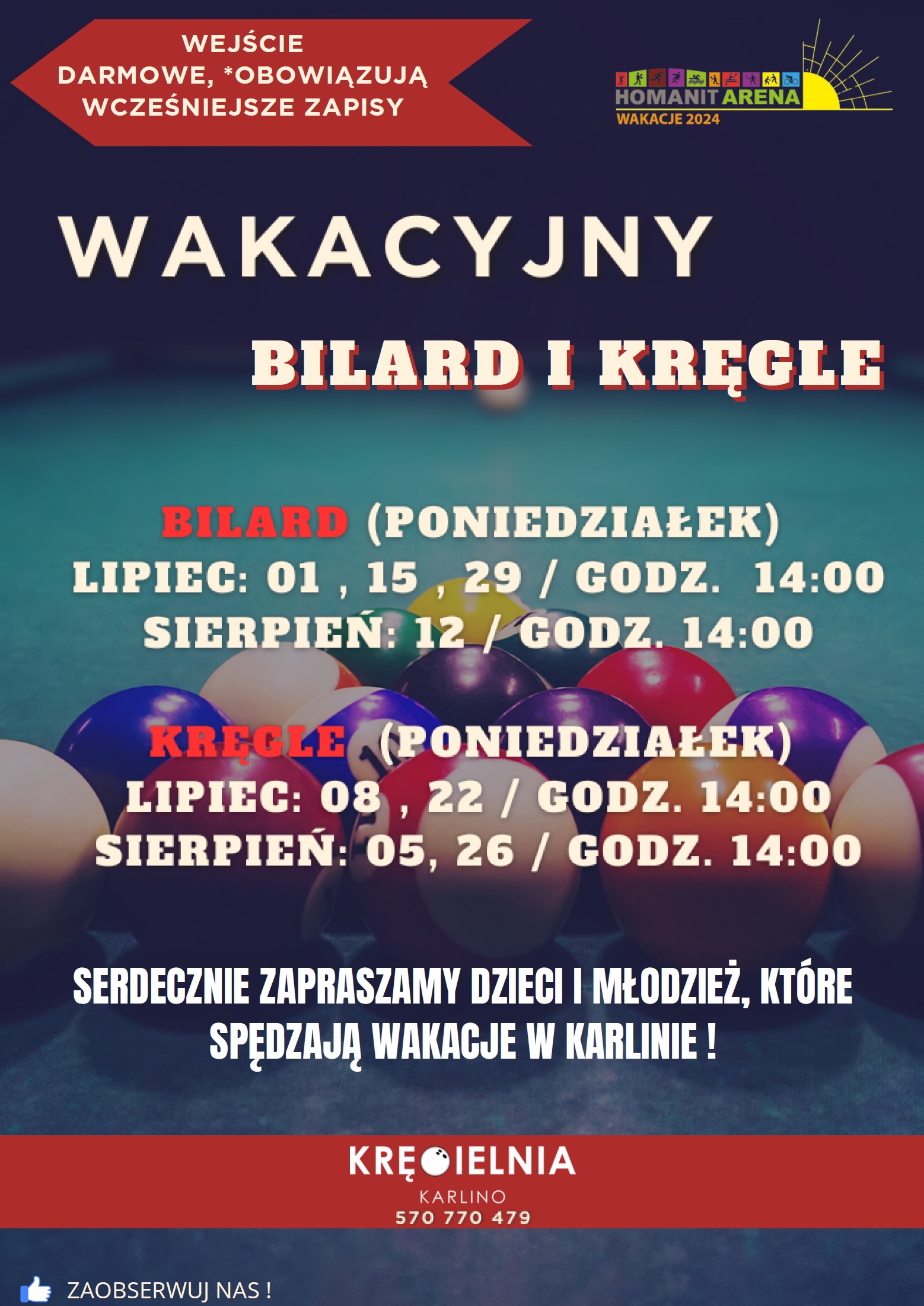 Zapraszamy na WAKACYJNY BILARD I KRĘGLE do Regionalnego Centrum Turystyki i Sportu w Karlinie (Hala Homanit Arena)- KRĘGIELNIA.