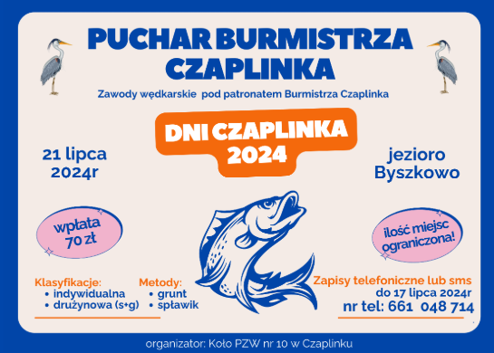 Czas na wydarzenie dla wszystkich miłośników wędkarstwa.Dołącz do zawodów, które odbędą się podczas Dni Czaplinka, 21 lipca 2024 roku, na urokliwym Jeziorze Byszkowo. Zawody odbędą się pod patronatem Burmistrza Czaplinka.