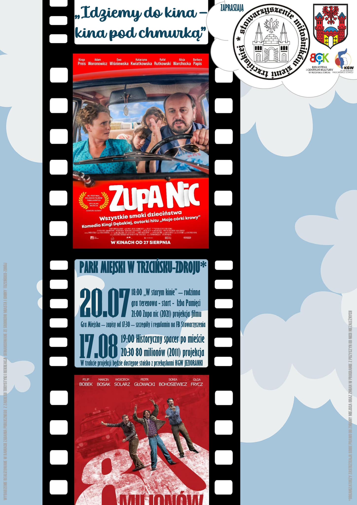 Tak brzmi nazwa naszego nowego projektu, na który chcemy wszystkich Państwa zaprosić! Bo łączymy przyjemne z pożytecznym, błogie zaleganie przed ekranem z odrobiną wysiłku fizycznego. W dwa weekendy tegorocznych wakacji serwujemy Państwu kino pod chmurką, a raczej pod gwiazdami! Tych na ekranie też nie zabraknie, bo zaprezentujemy dwie polskie produkcje w gwiazdorskich obsadach: “Zupa nic” z 2021 roku oraz “80 milionów” z 2011 roku. A wszystko to w plenerze pod gołym niebem na cyplu w Parku Miejskim w Trzcińsku-Zdroju! Będą leżaki, będą przekąski, w które będzie się można zaopatrzyć przy stoisku KGW Jezioranki ale zachęcamy by zabrać koce – pogoda nie zawsze nas rozpieszcza.