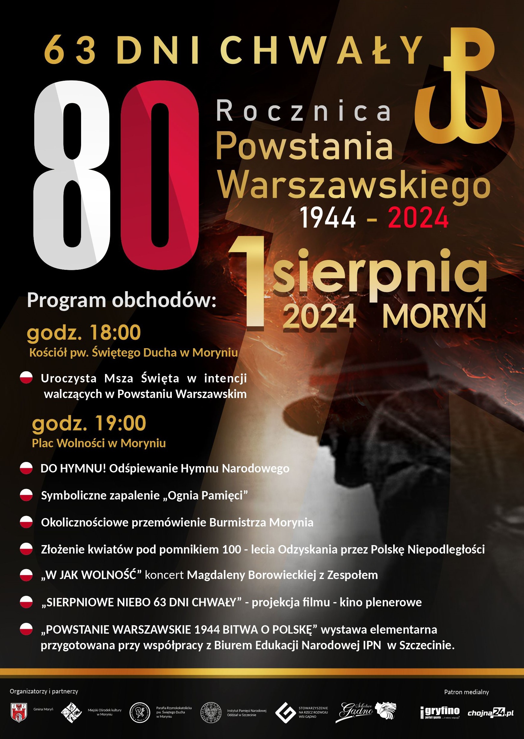 W tym roku z racji okrągłej- 80. rocznicy Powstania Warszawskiego 1 sierpnia o godz. 19.00 zapraszamy do wspólnego świętowania tego ważnego wydarzenia na Placu Wolności w Moryniu. W programie przygotowaliśmy koncert, projekcję filmu oraz tematyczną wystawę. Obchody rozpoczną się mszą świętą w Kościele pw. Ducha Świętego w Moryniu o godz. 18.00.
