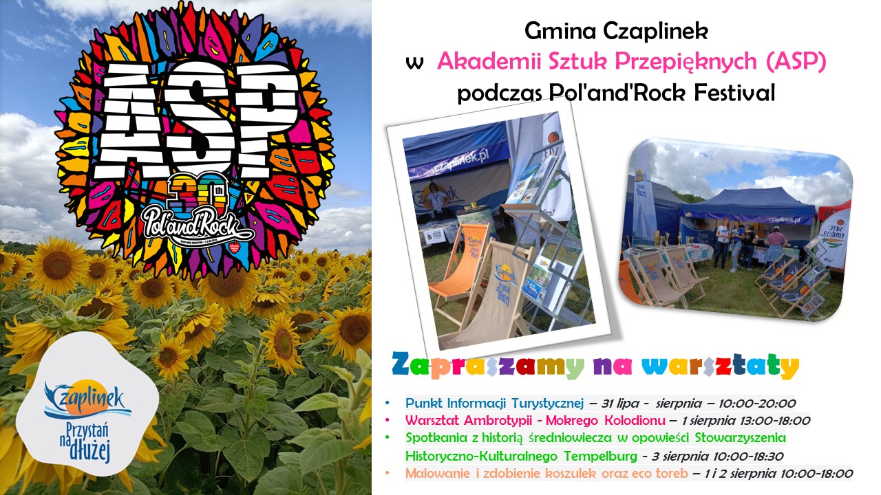 Zapraszamy na stoisko Gminy Czaplinek podczas Pol'and'Rock Festival 2024! Przygotowaliśmy dla Was mnóstwo atrakcji, które sprawią, że Wasz czas na festiwalu będzie jeszcze bardziej wyjątkowy. Dołączcie do nas na stoisku Gminy Czaplinek i odkryjcie, co dla Was przygotowaliśmy!