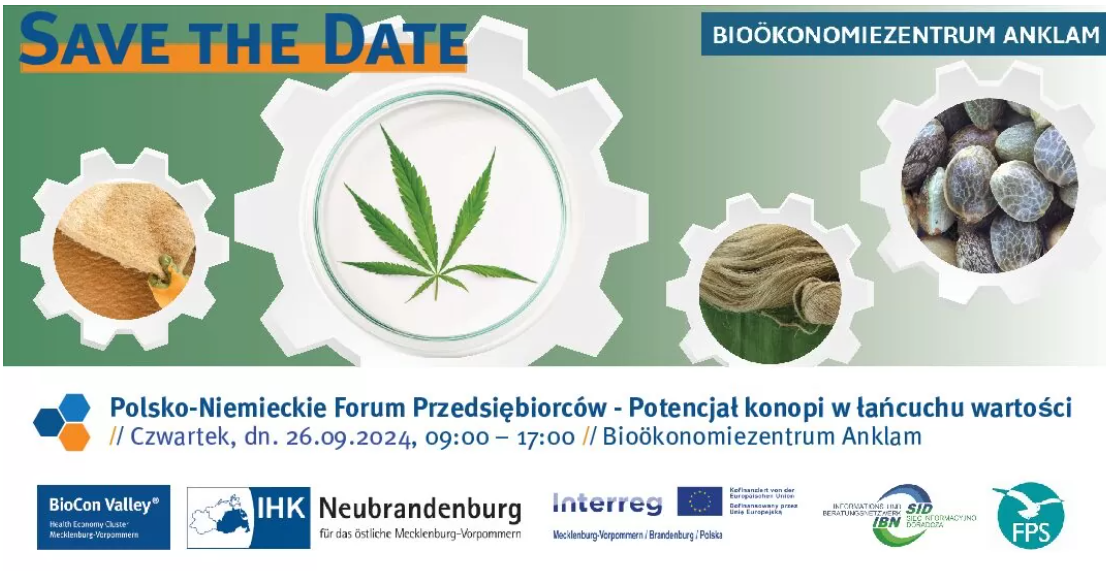 Sieć Informacyjno-Doradcza Euroregionu Pomerania w Greifswaldzie we współpracy z SID Przelewice, IHK Neubrandenburg, BioCon Valley i FPS Anklam zaprasza na Polsko-Niemieckie Forum Przedsiębiorców pt. „Potencjał konopi w łańcuchu wartości“, które odbędzie się 26.09.2024 r. w Bioökonomiezentrum Anklam (program poniżej). Celem wydarzenia jest pokazanie potencjału konopi jako zrównoważonego surowca oraz ich różnorodnych zastosowań gospodarczych w całym łańcuchu wartości w polsko-niemieckim obszarze gospodarczym.