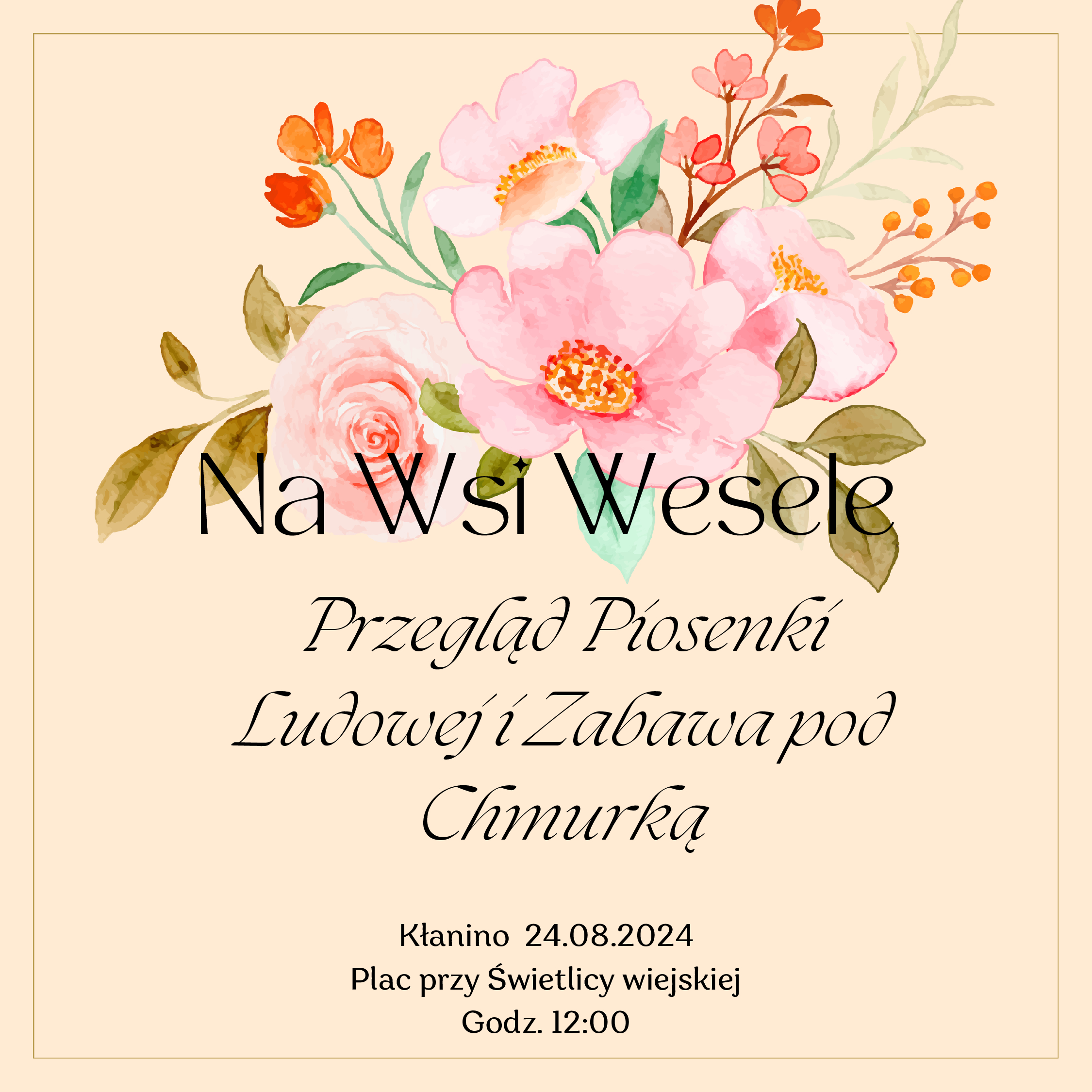 KGW " Ach te baby " Kłanino Sołectwo Kłanino zaprasza 24.08.2024 r. na godz. 12.00 na plac przy świetlicy wiejskiej w Kłaninie na Przegląd Piosenki Ludowej pod Chmurką pn. ,,Na Wsi Wesele"- projekt finansowany z budżetu Gmina Bobolice w ramach zadania publicznego „Podtrzymywanie i upowszechniania tradycji narodowej, pielęgnowania polskości oraz rozwoju świadomości narodowej, obywatelskiej i kulturowej”