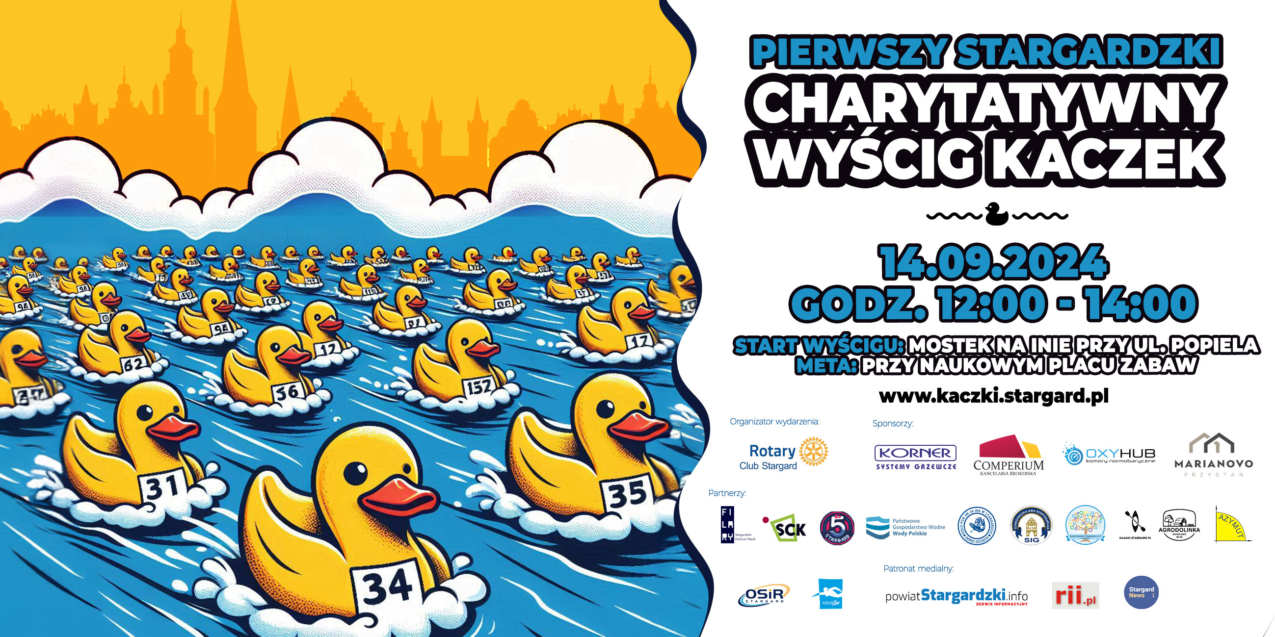 Pierwszy Stargardzki Charytatywny Wyścig Kaczek - zapraszamy na tegoroczny, ekscytujący i trzymający w napięciu ⚡️ pojedynek 500 żółtych gumowych kaczek na wodach stargardzkiej Iny.