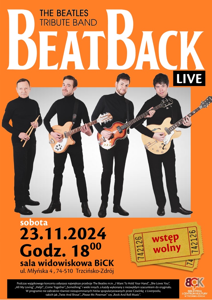 W sobotę 23 listopada 2024 r. o godz. 18.00 zapraszamy do sali widowiskowej BICK na koncert zespołu Beat Back, który zagra największe przeboje legendarnej grupy The Beatles. Wstęp wolny.