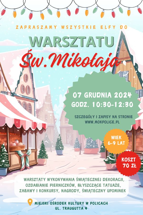 Wszystkich pomocników Świętego Mikołaja zapraszamy do jego niezwykłego warsztatu, w którym zadzieje się magia! To Wy będziecie bohaterami naszego spotkania i wcielicie się w pracowite elfy, które mają pełne ręce roboty i coraz mniej czasu, by zdążyć przed Bożym Narodzeniem. Jesteście gotowi, by pomóc Mikołajowi? Zadania będą wymagały od Was nie lada pomysłowości, ale na pewno znakomicie sobie poradzicie! W warsztacie Mikołaja udekorujecie pyszne i pachnące świąteczne pierniczki, a także przygotujecie piękną bożonarodzeniową dekorację. Weźmiecie też udział w grach i zabawach, bo – jak wiadomo – elfy uwielbiają psoty i figle. A po intensywnym dniu, spędzonym w pracowni Mikołaja, otrzymacie zasłużone upominki, które razem z wykonanymi wcześniej pracami zabierzecie ze sobą do domu!