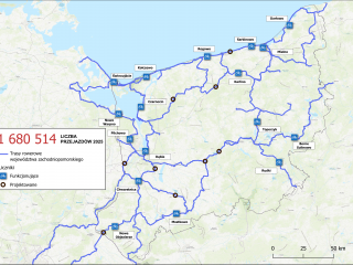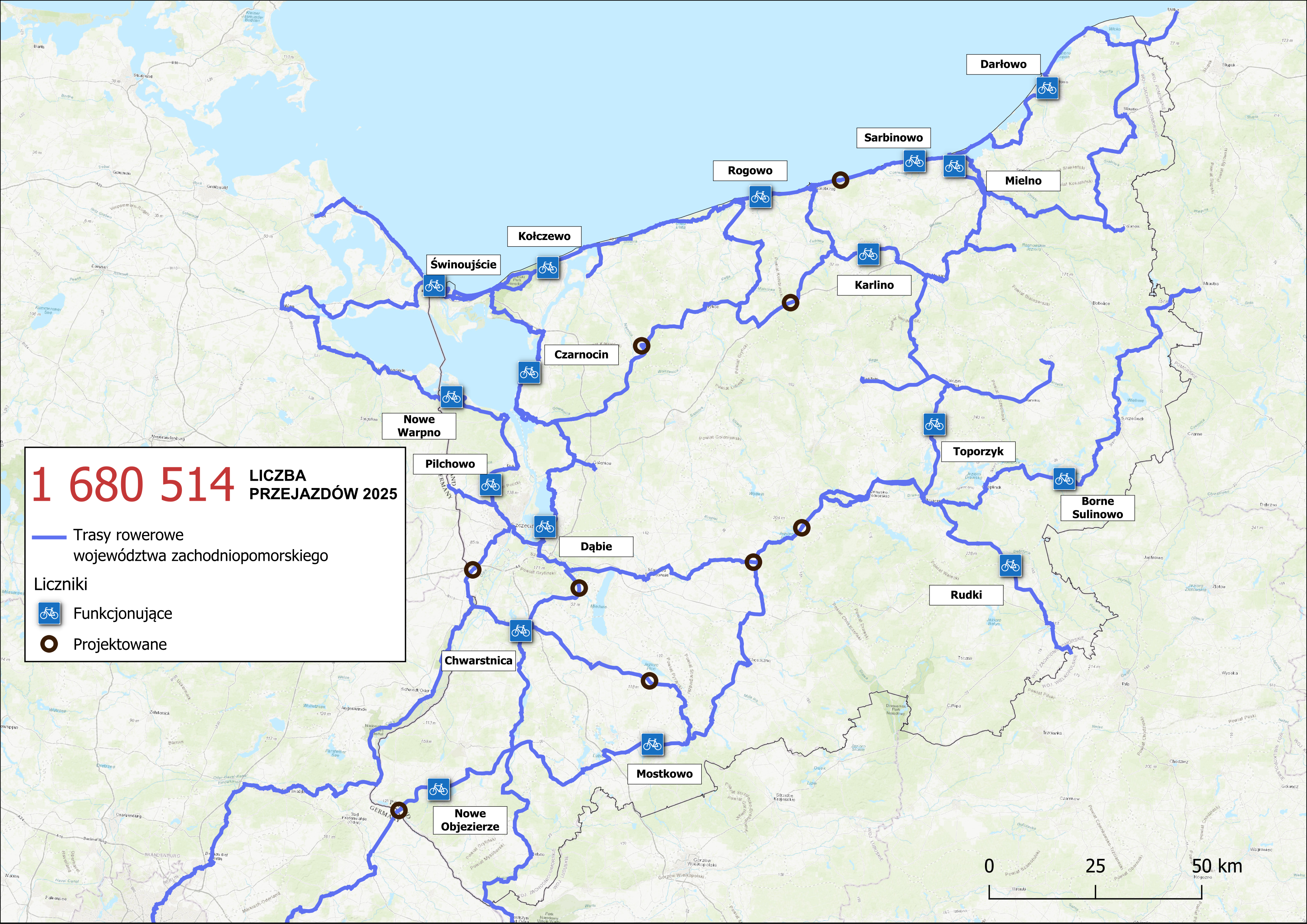 Obecnie w regionie funkcjonuje 17 liczników rowerowych, z czego najnowszy – w Rudkach koło Wałcza – został uruchomiony w ubiegłym roku (mapa w dużej rozdzielczości znajduje się na samym dole). Poza licznikiem w Świnoujściu, zlokalizowanym przy granicy i rozpoczynającym polski odcinek trasy Velo Baltica, wszystkie urządzenia znajdują się poza obszarami miejskimi. Ich głównym celem jest rejestrowanie ruchu turystycznego, zarówno jedno-, jak i wielodniowego. W całym 2025 roku odnotowaliśmy 1 680 514 przejazdów – wynik bardzo zbliżony do roku poprzedniego.