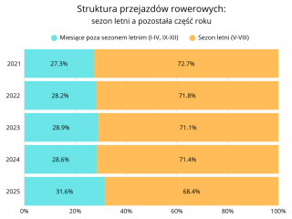 Mimo podobnej łącznej liczby przejazdów, rok 2025 obfitował w rekordy. Największą liczbę przejazdów w ciągu jednego dnia zarejestrowano 16 sierpnia – było to aż 21 330 rowerzystów. O wakacyjnych rekordach pisaliśmy szerzej w osobnym artykule. Rowerowe podsumowanie wakacji