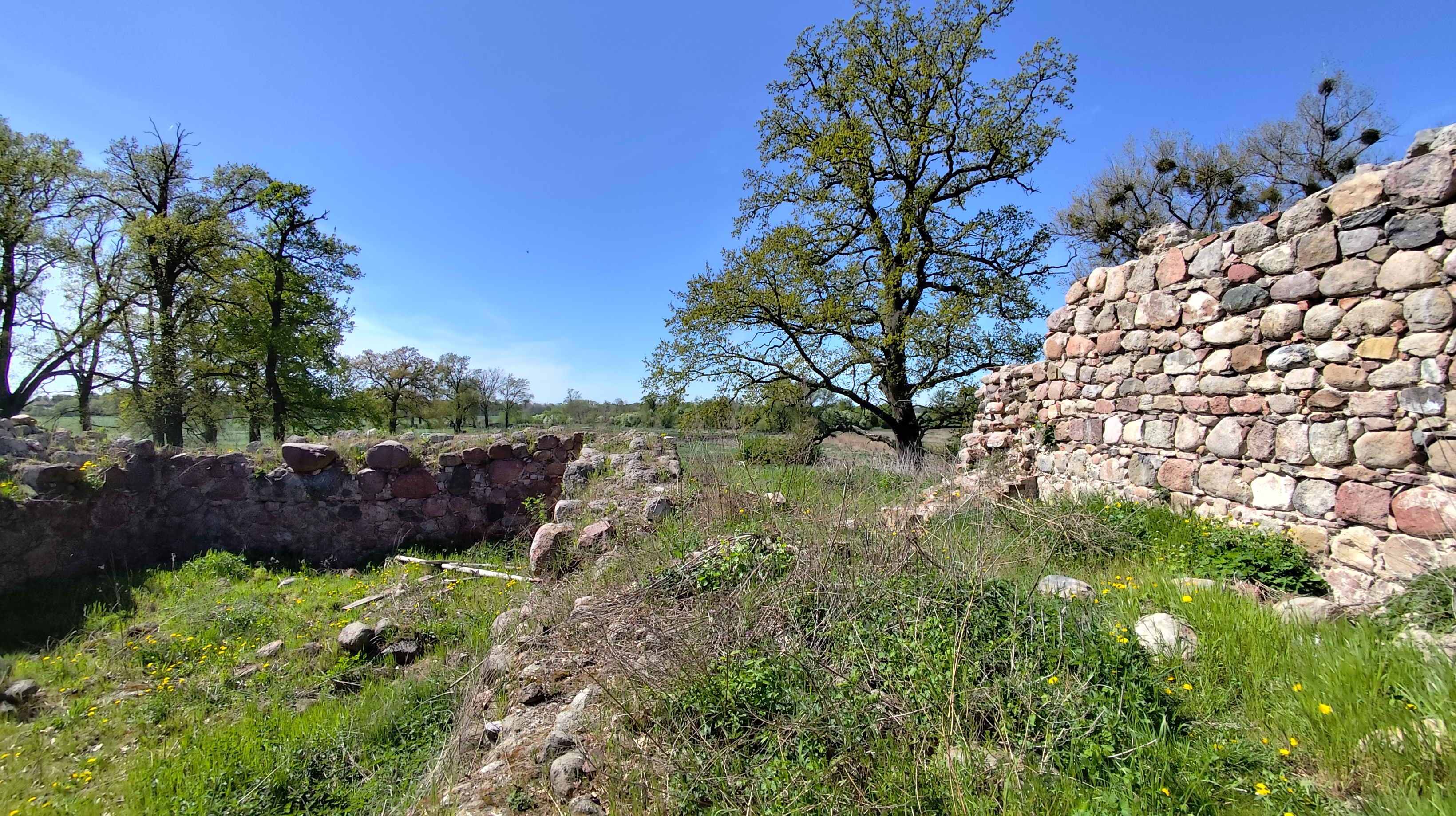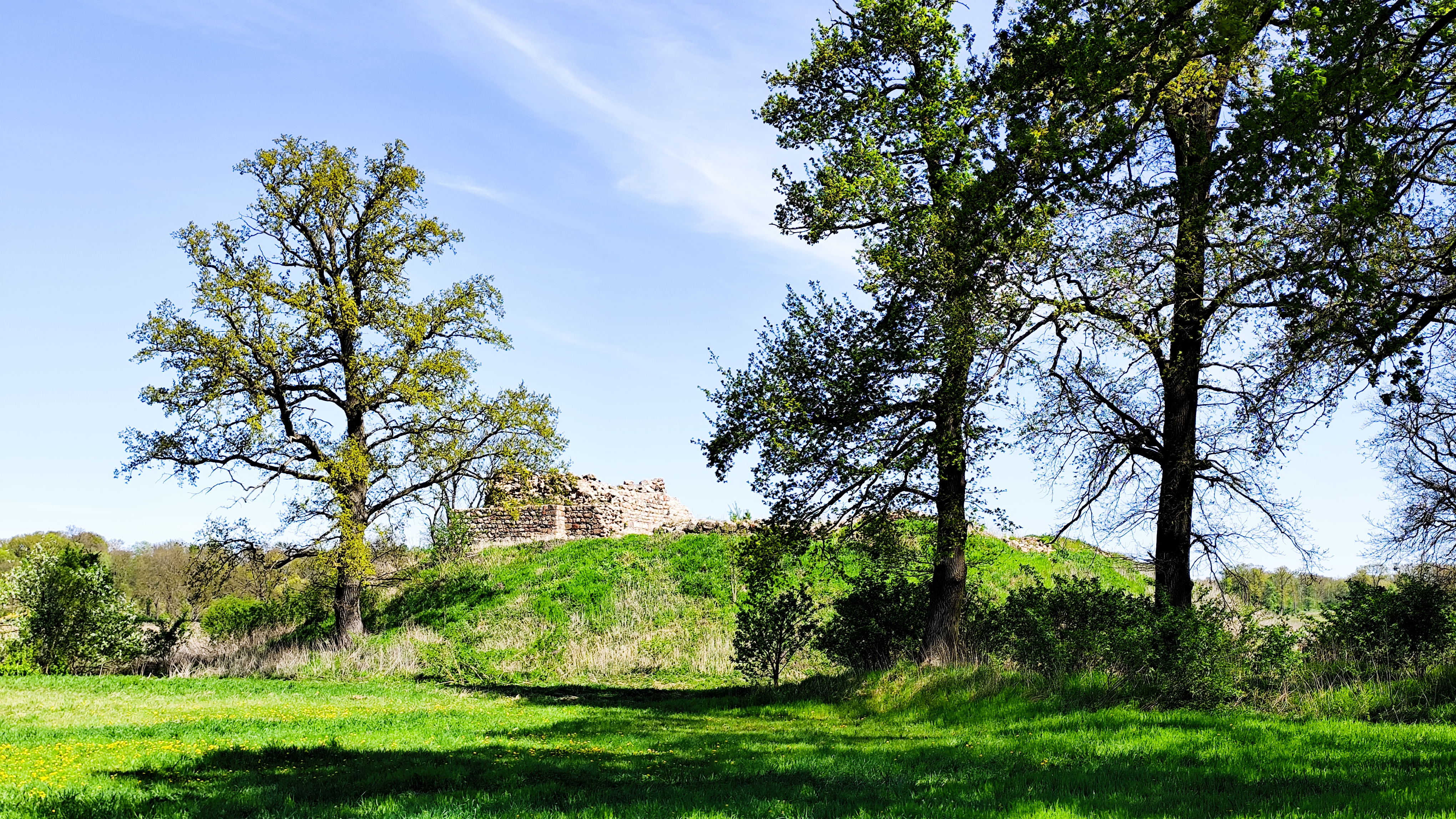 Burgruine am Fluss Ina - die ersten Befestigungsanlagen wurden kurz nach dem Übergang der örtlichen Güter an die Familie Wedel im Jahr 1305 errichtet. Das Fundament bestand wahrscheinlich aus Holz und Erde. Bereits 1338 wurde die Festung durch das Heer des Herzogs Barnim III. zerstört. Anstelle des zerstörten Kastells errichteten die Wedeler um die Mitte des 14. Jahrhunderts einen gemauerten Wohnturm, der auf einem 30 Meter langen quadratischen Grundriss mit Backsteinmauern versehen wurde. Im 15. Jahrhundert begann die vernachlässigte Burg langsam zu verfallen und wurde um 1500 aufgegeben. Heute sind nur noch die Reste der Erdgeschossmauern und die darüber erhaltenen Turmmauern erhalten.
