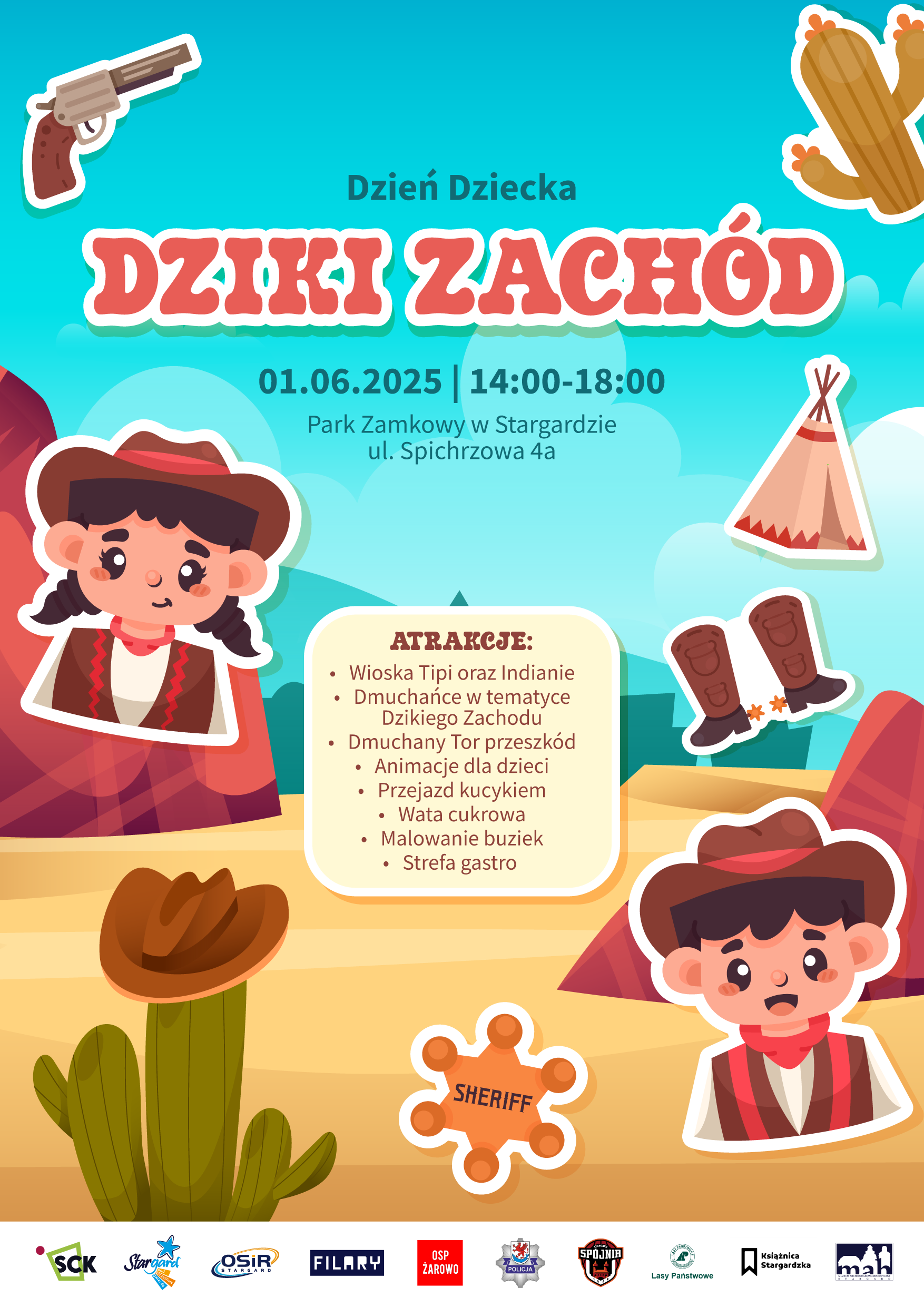 Kindertag - Wilder Westen 01.06.2025, Sonntag Burgpark, Stargard 14:00-18:00 Uhr Im Herzen von Stargard an der Weißkopfbastion kehrt eine der am meisten erwarteten Familienveranstaltungen zurück! Der "Kindertag - Wilder Westen" ist ein bunter, fröhlicher Raum voller thematischer Attraktionen, die die Jüngsten (und nicht nur sie!) in die Welt der Abenteuer, Sheriffs und Indianergeschichten entführen! Das kostenlose Programm umfasst.Indianerdorf mit Tipi-Zelten und Animationen, die von der Kultur der Ureinwohner Amerikas inspiriert sind - Riesige Hüpfburgen, darunter ein riesiger Hindernisparcours für kleine Draufgänger - Entdeckungszone (SCN FILARY) - Sportzone (OSiR) Kostenpflichtiges Programm: