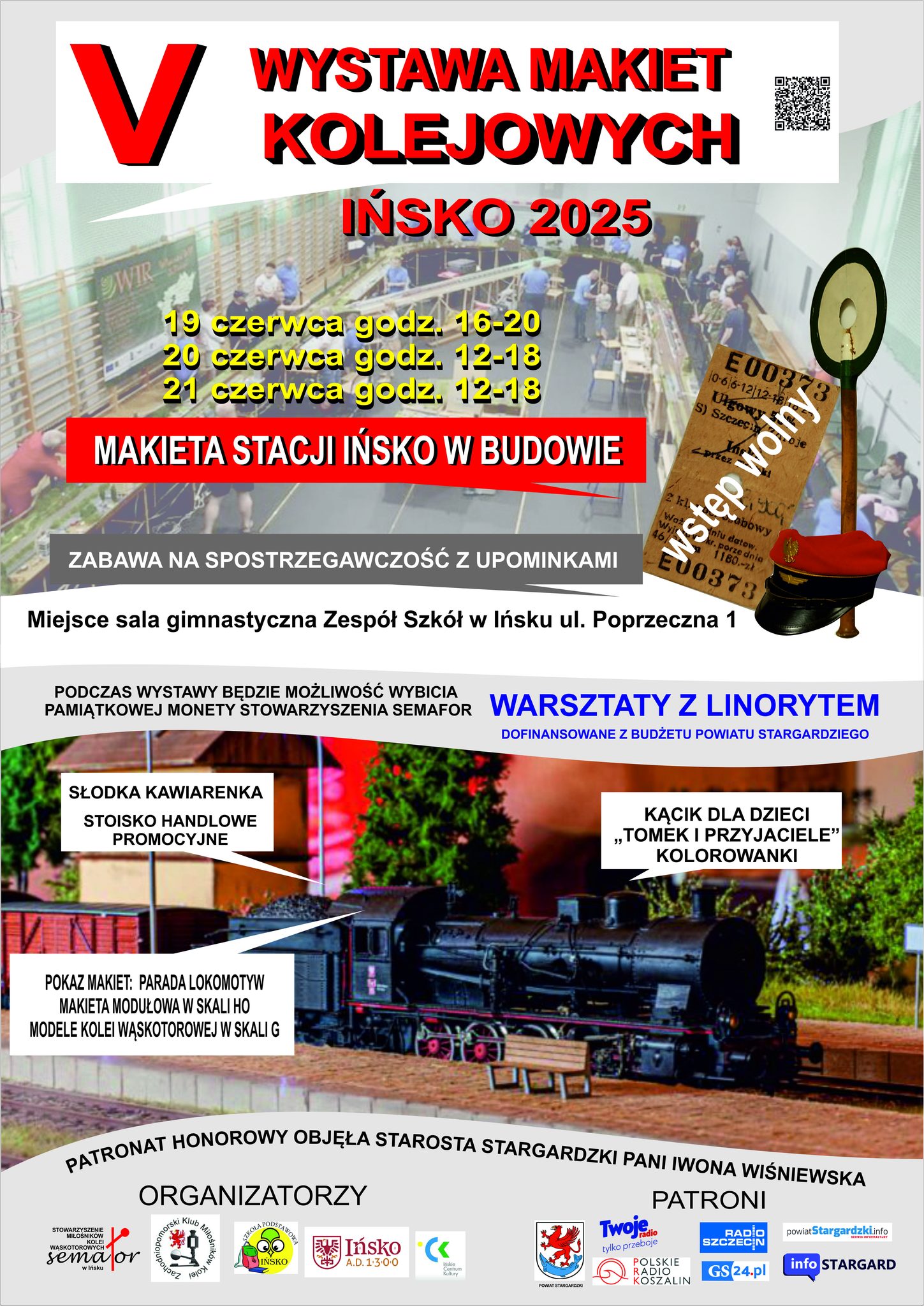 Zum fünften Mal laden wir Sie in die bezaubernde Stadt Ińsk ein, wo wir inmitten der Natur eine von Modellbauern des Westpommerschen Eisenbahnclubs vorbereitete H0-Eisenbahnattrappe und eine von Herrn Krzysztof aus Dobrzany präsentierte Garteneisenbahn der Spur G sehen werden. Für Kinder gibt es eine Spielzone: Tom und seine Freunde und künstlerische Aktivitäten sowie einen Linolschnitt-Workshop, bei dem man eine bedruckte Erinnerungstasche mit nach Hause nehmen kann.