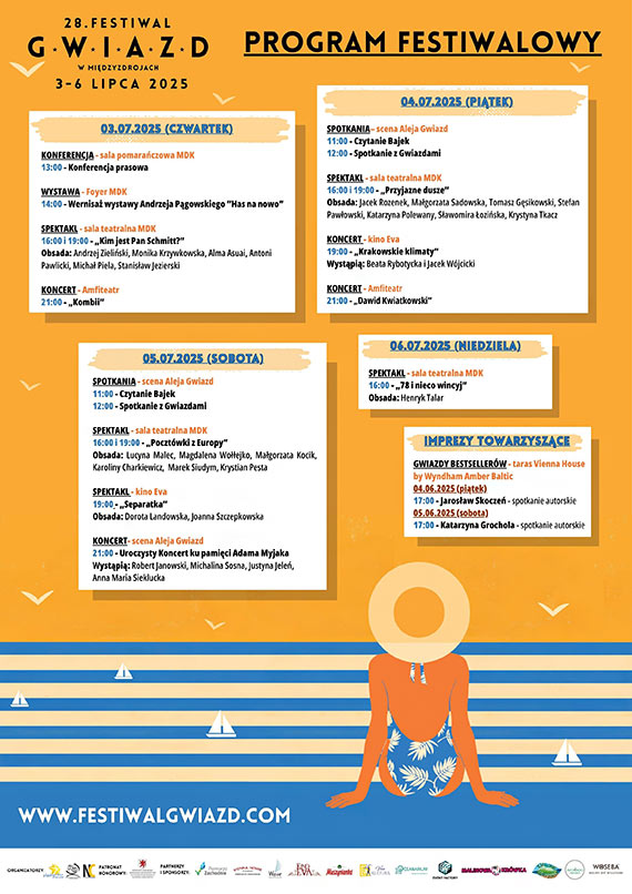 Sehr geehrte Damen und Herren! Wir laden Sie herzlich zum 28. Festival der Stars in Międzyzdroje ein, das vom 3. bis 6. Juli 2025 stattfindet! Es erwarten Sie unvergessliche Theateraufführungen, Konzerte, Begegnungen mit Stars, Märchen für die Kleinsten und Begleitveranstaltungen mit bekannten Autoren. Kommen Sie und erleben Sie die Magie der Kunst, des Theaters und der Musik am Meer! Wir sehen uns in Międzyzdroje!