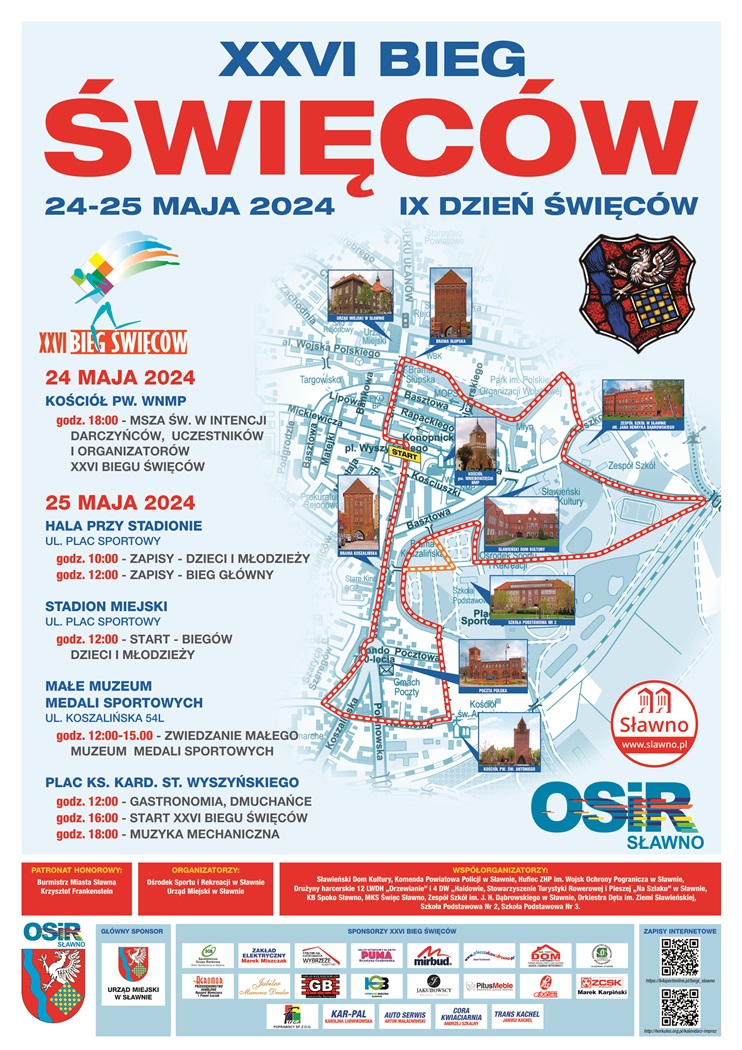 25 maja 2024r. w Sławnie odbędzie się XXVI Bieg Święców. Impreza biegowa organizowana w naszym mieście od 1997 roku. Nazwa biegu związana jest z historią Ziemi Sławieńskiej. Start i meta umiejscowione będą obok kościoła pw. Wniebowzięcia Najświętszej Marii Panny w Sławnie. Zawodnicy na trasie o długości 10 km (3 x 3,3km), przebiegają pod Bramą Słupską Koszalińską z XV wieku oraz obok innych historycznych budynków. Termin biegu nawiązuje do daty otrzymania przez Sławno praw miejskich od rodu Święców - 22 maja 1317r. Przed biegiem głównym (10km), odbędą się biegi dla dzieci i młodzieży na dystansach od 200 do 800m. Wszyscy uczestnicy otrzymają pamiątkowe medale. Biegi dziecięco-młodzieżowe odbędą się po raz pierwszy na nowej bieżni stadionu miejskiego w Sławnie!
