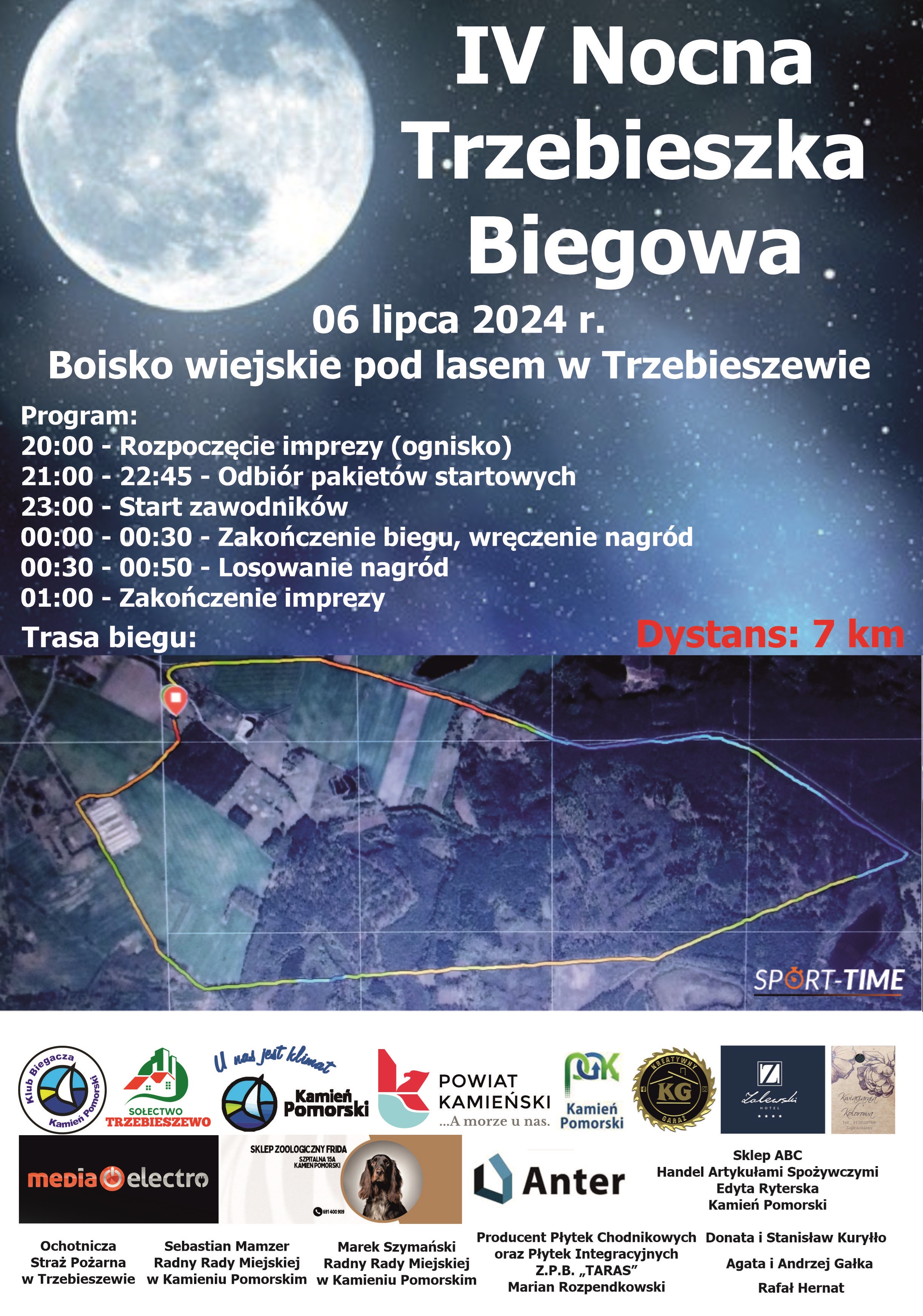 Am Samstag, den 06.07.2024. findet in Trzebieszewo, Gemeinde Kamień Pomorski, die 4. Auflage des "Night Run" statt. Es handelt sich um eine Laufveranstaltung, die vom Läuferclub Kamień Pomorski organisiert wird und an der Dutzende von Läufern aus ganz Polen teilnehmen.