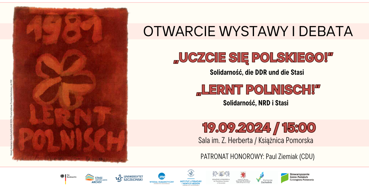 Das Bundesarchiv/Stasi-Unterlagen-Archiv (Berlin, Neubrandenburg), die Universität Szczecin und die Książnica Pomorska freuen sich, Sie zur Eröffnung der Ausstellung "Lernt Polnisch!" einzuladen. Solidarność, die DDR und die Stasi / "Lernt Polnisch!" Solidarność, die DDR und die Stasi und einer deutsch-polnischen Diskussion mit Kinga Hartmann, Helga Hirsch, Wolfgang Templin, Kazimierz Wóycicki und Monika Stefanek ein.