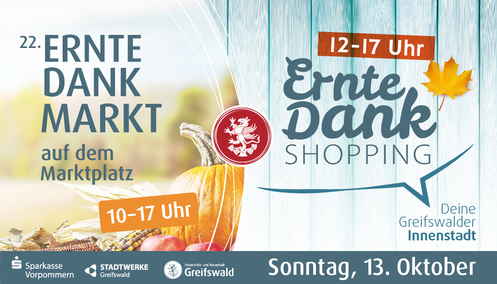 Ab 12:00 Uhr lädt der Greifswalder Innenstadtverein zum Herbstshopping ein. Dann öffnen die Geschäfte in der Innenstadt ihre Türen. Hier kann nach Herzenslust gebummelt, gekauft und geschlemmt werden.