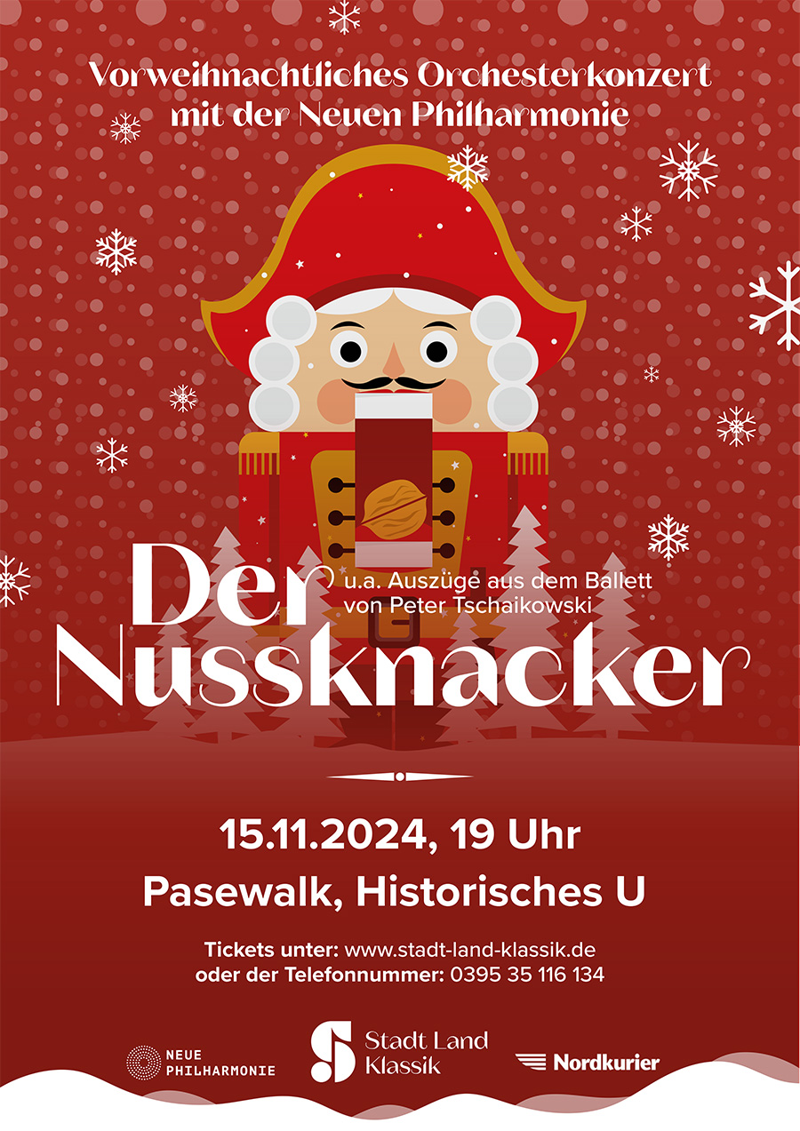 Das romantische Märchen „Der Nussknacker“ von Pjotr Iljitsch Tschaikowski spielt in der magischen Weihnachtsnacht. Die junge Clara erhält von ihrem Patenonkel Drosselmeyer einen wundersamen Nussknacker, der in der Nacht zum Leben erwacht. Gemeinsam kämpfen sie gegen den furchterregenden Mäusekönig und seine Armee, bevor sie in ein fantastisches Reich voller lebendiger Süßigkeiten und bezaubernder Tänze reisen. Clara und ihr Nussknacker nehmen die Zuschauer mit in ihr Abenteuer voller Wunder und Freundschaft.