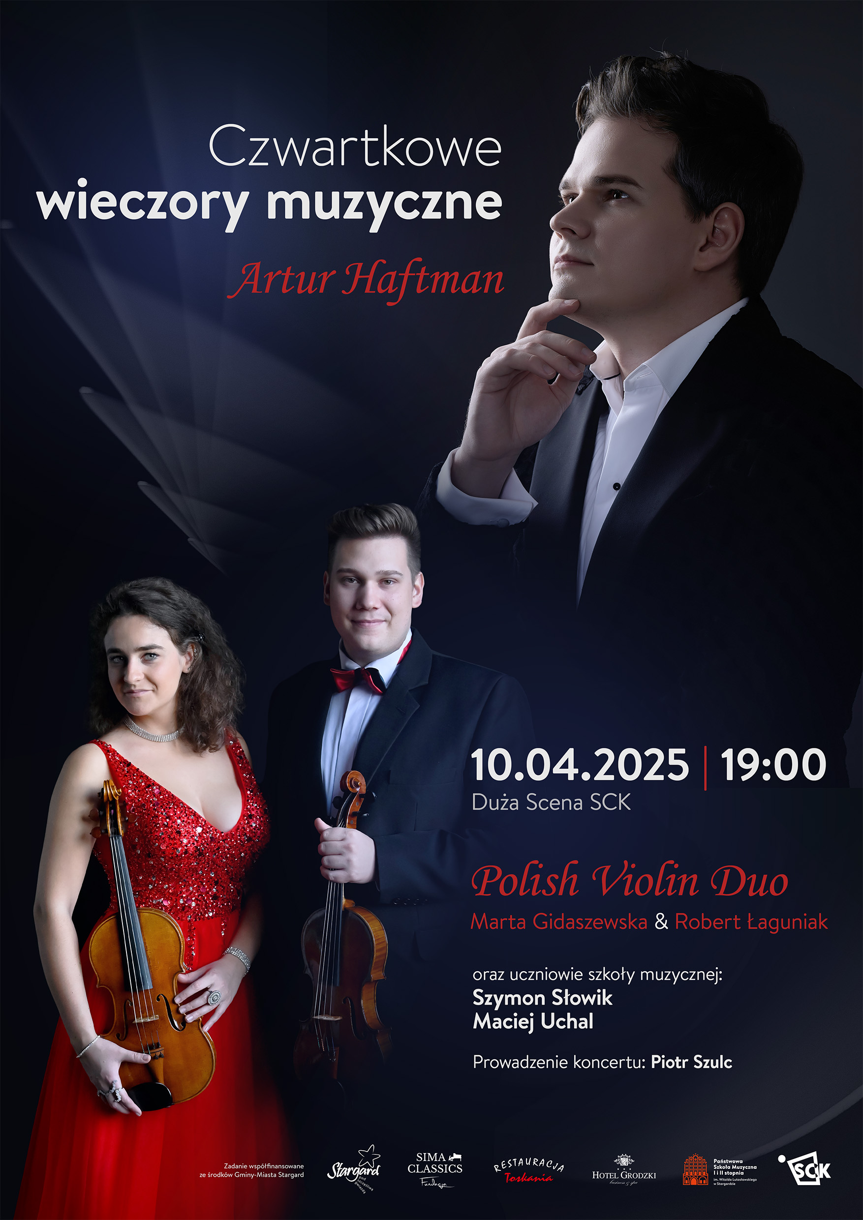 We cordially invite you to a unique evening full of musical sensations as part of the first installment of "Thursday Musical Evenings". On stage, Artur Haftman - pianist, who will present works by the most outstanding composers. The maestro will be accompanied by the Polish Violin Duo, which consists of violinists Marta Gidaszewska and Robert Laguniak. On stage we will also see young talents - students of the State Music School of the 1st and 2nd degree in Stargard: Szymon Slowik (viola) and Maciej Uchal (vibraphone).